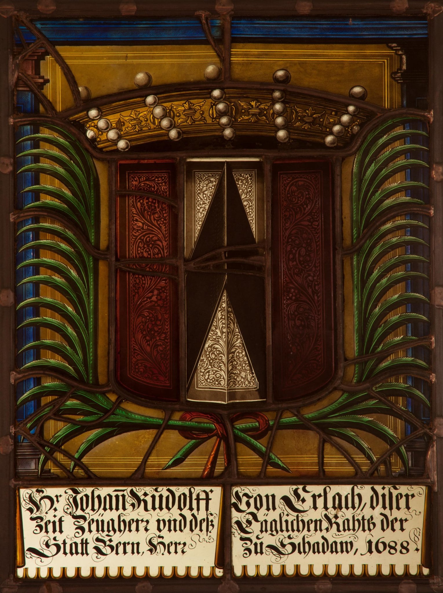Hasler, R., & Schiffhauer, A. (2016). Wappenscheibe Johann Rudolf der Jüngere von Erlach, Herr zu Schadau. Dans Vitrosearch. Consulté le 5 décembre 2025 de https://www.vitrosearch.ch/objects/2248920.