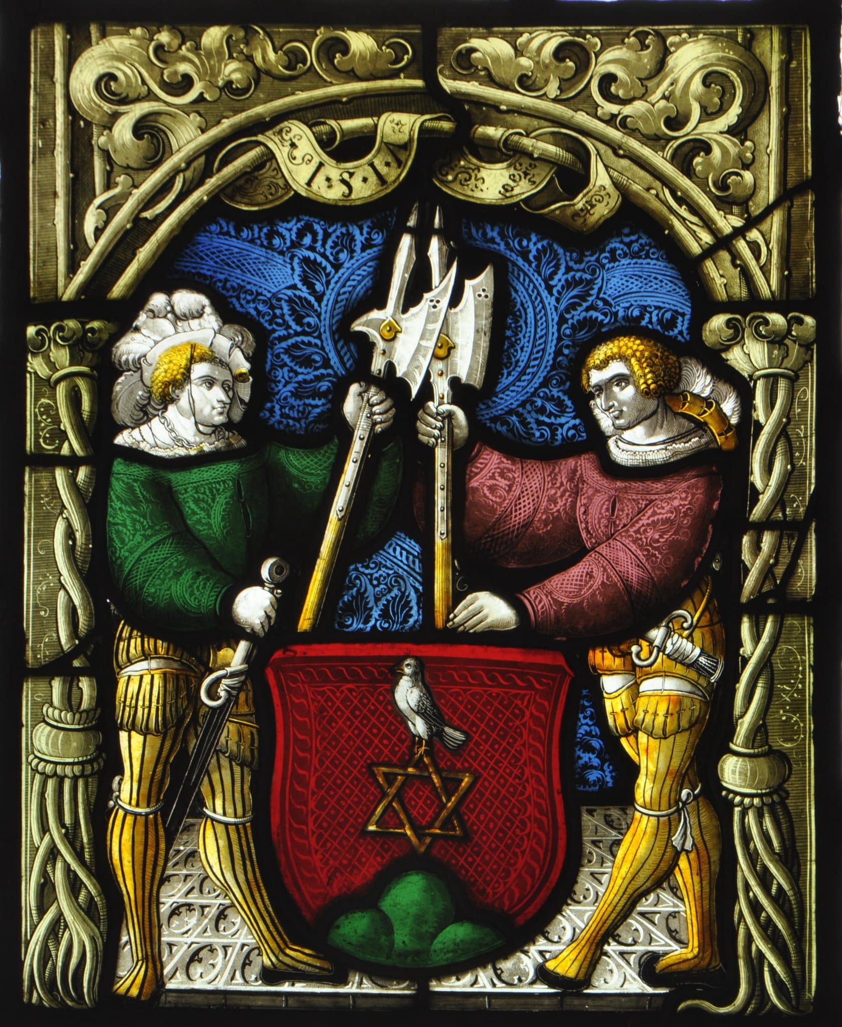Den Wappenschild begleiten zwei vor blauem Damastgrund auf hellgrauem Fliesenboden stehende Halbartiere. Beide sind schwertbewaffnet sowie mit einem langärmeligen grünen beziehungsweise lila Hemd, gelb-schwarz gestreiften Strümpfen und einem Federbarett bekleidet. Die architektonische Rahmung bildet eine gelblichgrüne Arkade aus verschlungenen, sich nach unten in Wurzelwerk auflösenden Stämmchen. Am Scheitel des mit eingerolltem Blattwerk geschmückten Astbogens ist in einem Schriftband das Stiftungsjahr festgehalten.