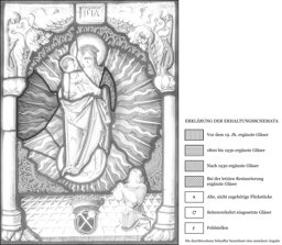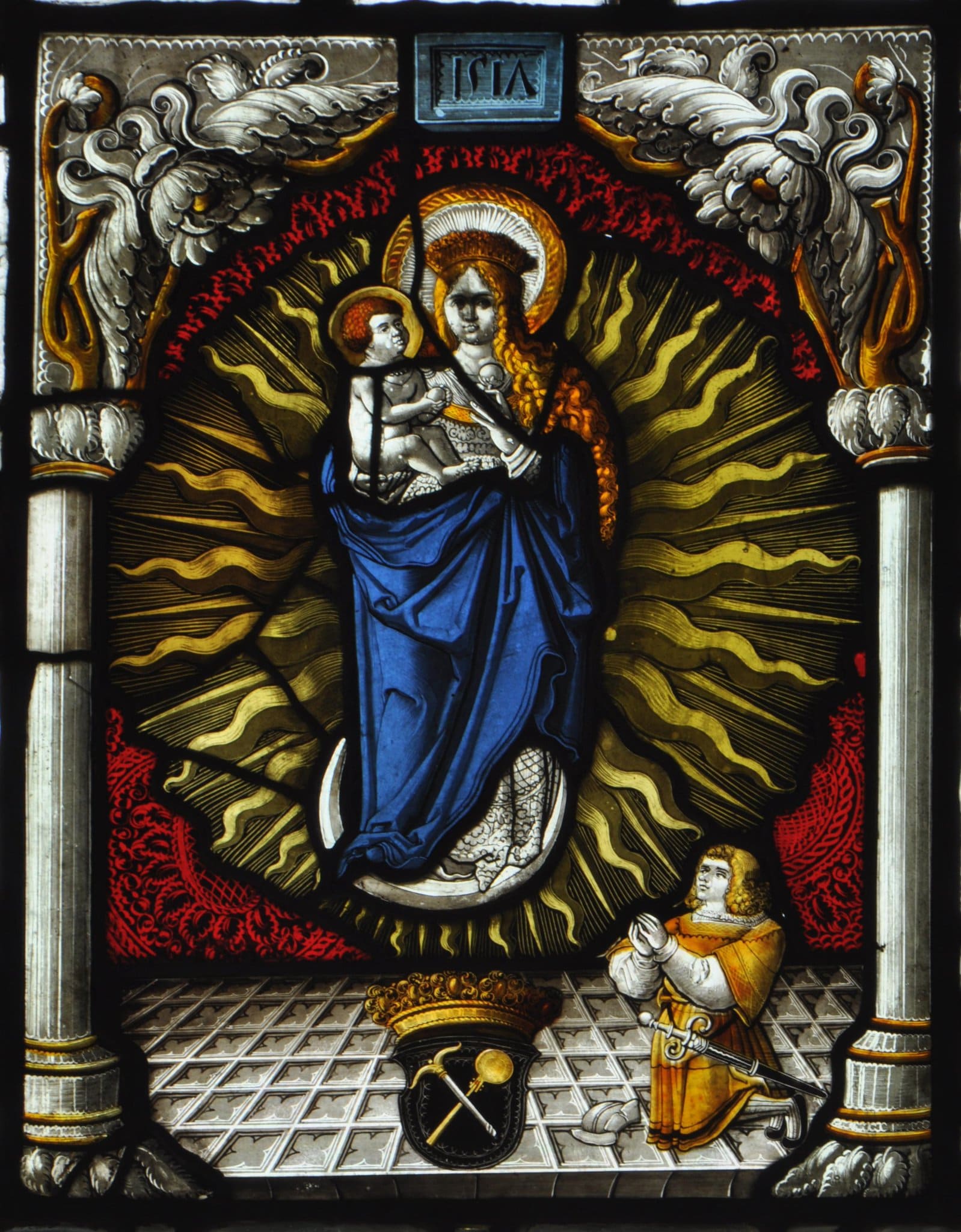 Vor rotem Damastgrund auf der Mondsichel in einem riesigen Strahlenkranz schwebend, hält die Muttergottes den Christusknaben in ihrer rechten sowie eine Blütenknospe(?) in ihrer linken Hand. Sie ist in ein weisses Gewand und einen blauen Mantel gekleidet. Das direkt unterhalb von ihr dargestellte bekrönte Wappen wird von seinem Inhaber begleitet, einem vornehmen jüngeren Herrn in gelbem Gewand, der mit gefalteten Händen auf dem Fliesenboden kniet und andachtsvoll zur Muttergottes emporblickt. Die Figuren umfasst eine Rahmung aus schlichten Rundpfeilern und einem mit Blattwerk geschmückten Astbogen, an dessen Scheitel das Stiftungsjahr in einer blauen Tafel festgehalten ist.