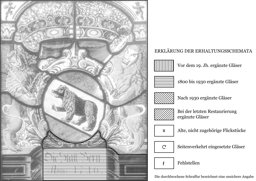 In einer ovalen Rocaille-Kartusche wird das Wappen Berns vor blauem Damastgrund von einer mit einem roten Vorhang behängten Krone überhöht. Den Wappenschild halten zwei Löwen mit Zepter bzw. Schwert. Sie stehen auf mächtigen roten Podesten, zwischen denen sich die Tafel mit der Stifterinschrift befindet. Hinter den Löwen erheben sich zwei einen Flachbogen tragende bräunlichrote Pfeiler. Auf den Säulenkapitellen duellieren sich zwei Bären mit Spiessen.