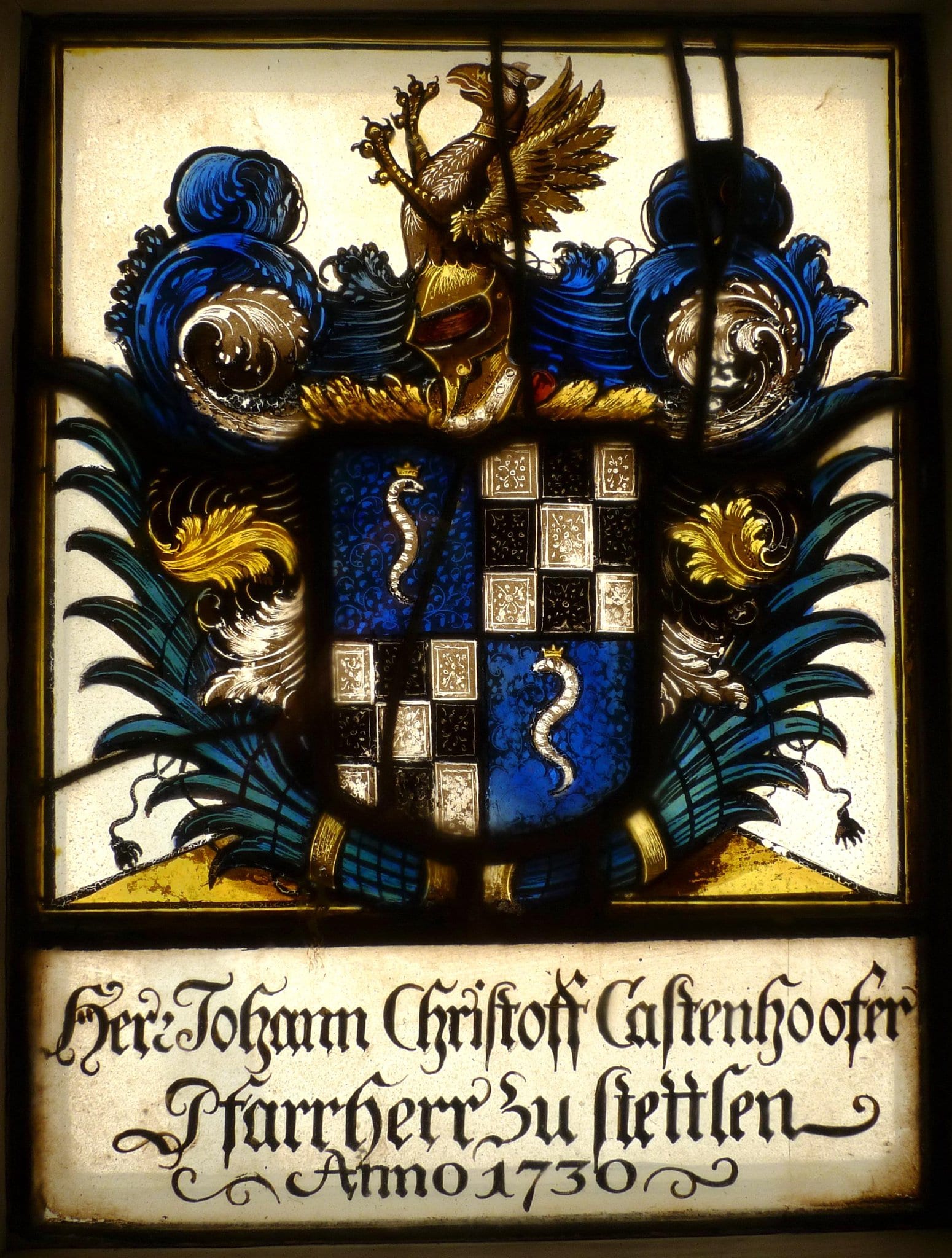 Johann Christoph Kasthofer (4.8.1695–Mai 1733), Sohn des Spitalmeisters zu Aarau Hans Heinrich Kasthofer (* 1666) und der Salome Imhof (1674–1745), schlug die geistliche Laufbahn ein, wurde 1724 Inselprediger in Bern und 1730 Pfarrer in Stettlen. Seit 1730 war er mit Maria Giot († 1766), einer aus Frankreich geflüchteten Protestantin verheiratet (Born 1991, S. 51, 113f.; Kessel 2015). Für seine in die Kirche gestiftete Wappenscheibe kam finanziell sein Schwiegervater Giot mit 12 Kronen auf (Born 1991, S. 67). Der Pfarrer starb schon im relativ jungen Alter von 37 Jahren. Seine Grabplatte von 1733 hat sich in der Kirche Stettlen erhalten (Born 1991, Abb. 10).