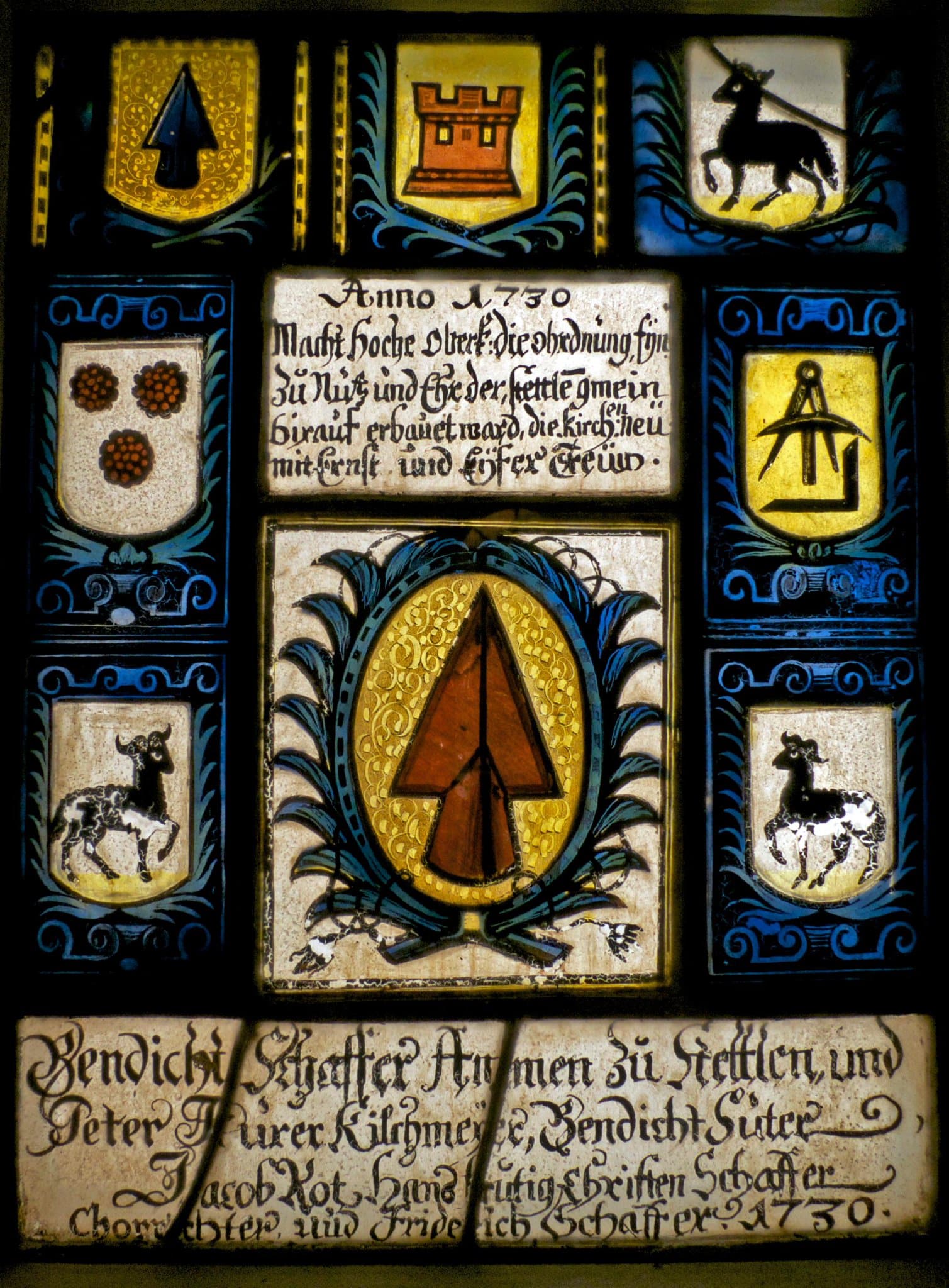 Die Scheibe Stettlens beinhaltet die Wappen des dortigen Ammans Benedikt (Bendicht) Schaffer, der vier Chorrichter Christian Schaffer, Benedikt Suter (Sutter), Jakob Rot und Hans Frutig sowie des Kirchmeiers Peter Murer. Das Amt Friedrich Schaffers ist nicht geklärt.