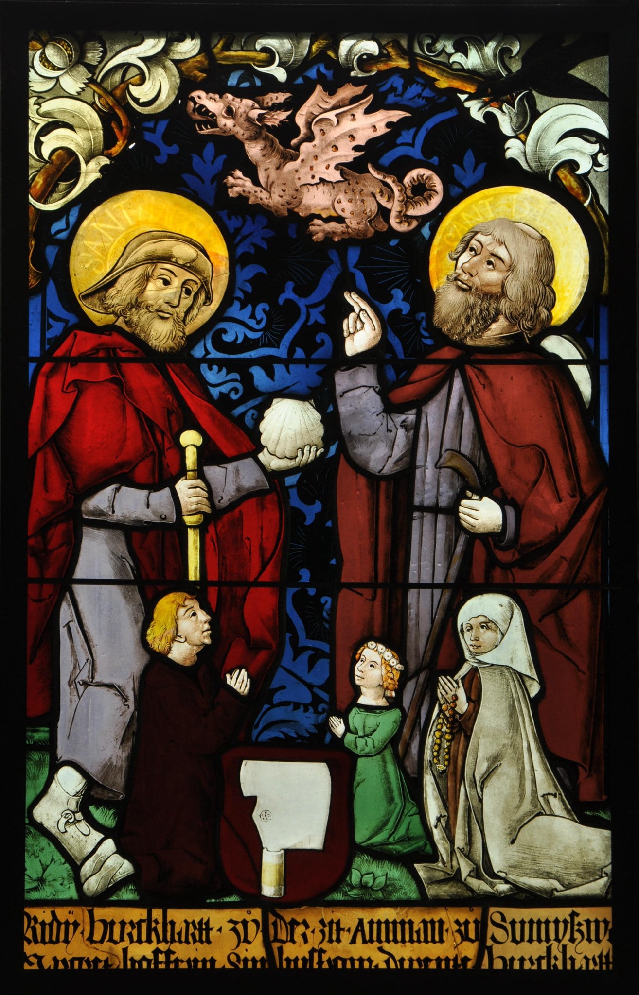 Vor blauem Damastgrund stehen auf grünem Rasen die Heiligen Jakobus und Beat in hellvioletten Gewändern und roten Mänteln. Während der hl. Jakobus maior in seinen Händen eine Muschel, Trinkgefäss bzw. Zeichen der Pilger, und den Wanderstab hält, weist der hl. Beat auf den von einem Raben verfolgten Drachen, den er aus der Höhle über dem Thunersee vertrieb. Über den beiden Heiligen wölbt sich ein Astbogen mit Blattwerk. Zu Füssen der Heiligen knien andachtsvoll Ridy (Rudolf) Burkhart mit seiner Tochter Durente und seine den Rosenkranz haltende Gemahlin Margaretha Hofer. Mit angewinkelten Armen stützt sich der Stifter auf seinen vor ihm platzierten Wappenschild. Die Stifternamen befinden sich im gelben Streifen unterhalb von Figuren und Wappen.
