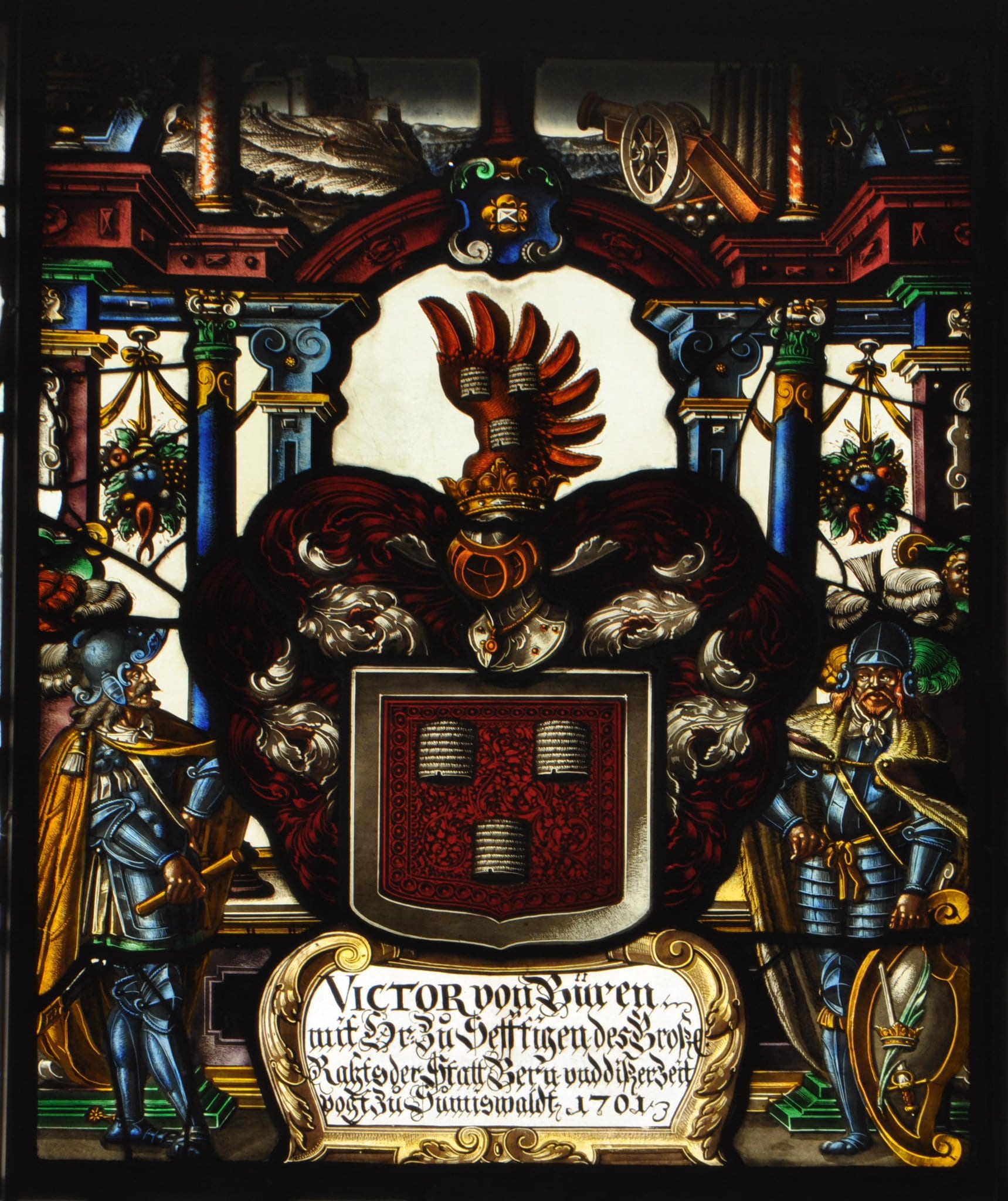 Hasler, R., Keller, S., & Bergmann, U. (2016). Wappenscheibe Johann Karl von Büren. Dans Vitrosearch. Consulté le 5 décembre 2025 de https://www.vitrosearch.ch/objects/2249818.