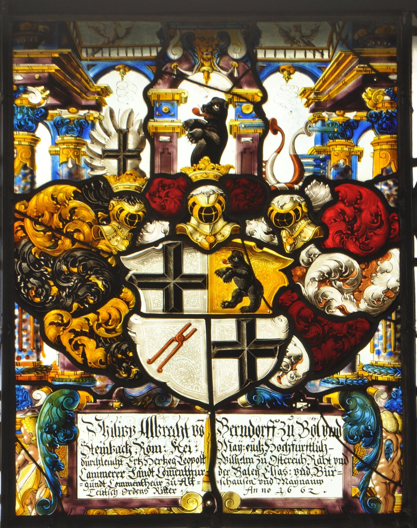 Hasler, R., Keller, S., & Bergmann, U. (2016). Wappenscheibe Philipp Albrecht von Berndorff. Dans Vitrosearch. Consulté le 5 décembre 2025 de https://www.vitrosearch.ch/objects/2249924.