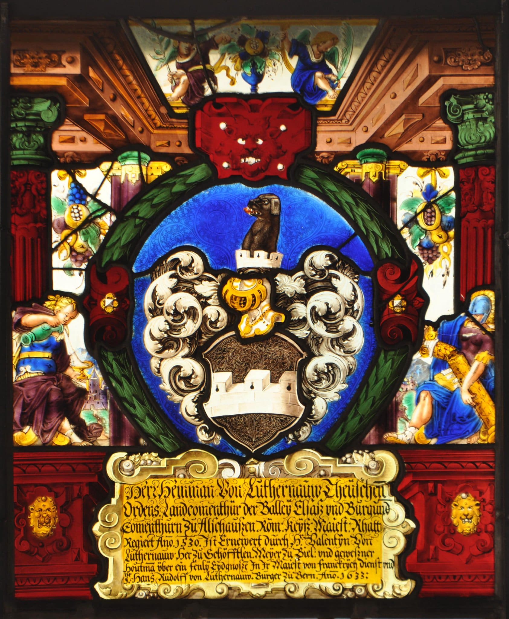 Herr Hemman Von Luthernauw Theüschen / Ordens Landcomenthür der Balleÿ Elsaβ vnd Burgund / Comenthurn zů Alschauβen. Röm: Keÿβ: Maiest: Rhatt / Regiert Ano 1530. Jst Ernewert durch Hr: Valentÿn Von / Luthernauw Her Zů Schöfftlen. Meÿer Zu Biel: vnd geweβner / houtma vber ein fenlÿ Eÿdgnoβe Jn Jr Maiest. von franckrÿch dienst vnd / Jr. Hans Růdolff von Luthernauw. Burger zů Bern Ano. 1633.