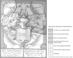 Das Glas mit der Helmzier, das Eckstück oben rechts und der Grossteil der darunter befindlichen Helmdecke neu ergänzt; Sprungbleie; die Verbleiung erneuert.
