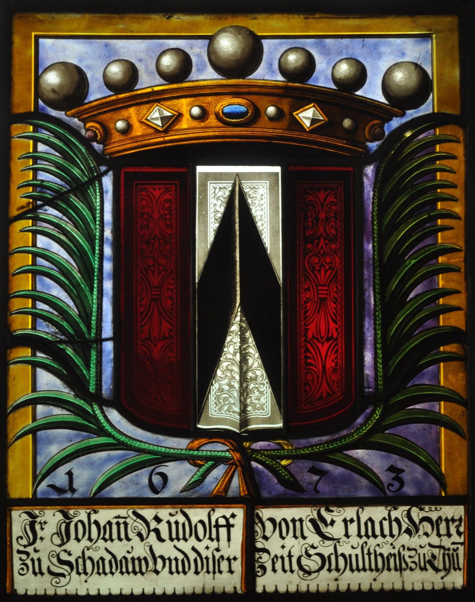 Hans Lehmann, Die zerstörten Glasgemälde in der Kirche Hindelbank und ihre Beziehungen zur Familie von Erlach, in: Berner Kunstdenkmäler, Bd. 4, o. J. [1913], S. 20.
