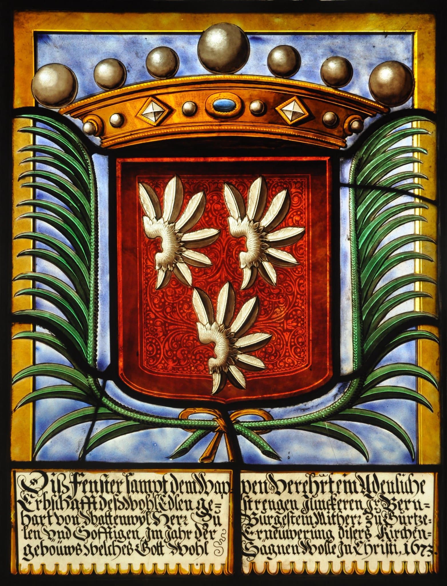 Diβ Fenster sampt dem Wappen verehrt ein Adenliche / Erbschafft deβ Wohl Edlen ge= strengen Junckeren Jr. Bern= / hart von Wattenwÿl Herr Zů Burgestein Mitherr Zů Gůrtze= / len vnd Sofftigen, Jm Jahr der Erneüwerung diserβ Kirchen= / geböüws welcheβ Gott wohl Sägnen Wolle Jn Christi, 1673.