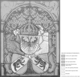 Farbiges Glas; Bemalung mit Schwarzlot (Originalstücke).