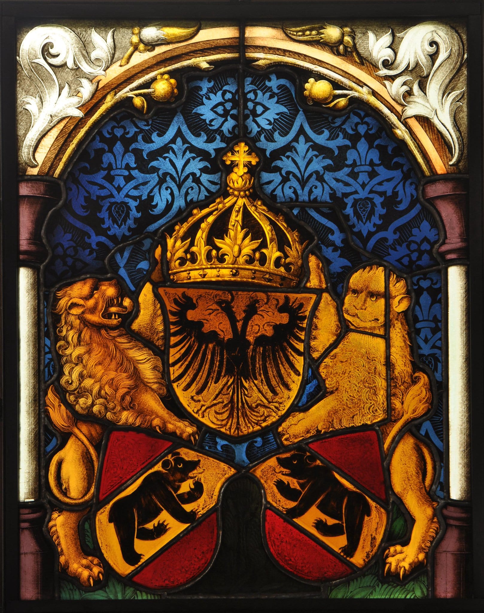 Vor blauem Damastgrund erscheint die bekrönte Wappenpyramide Bern-Reich. Sie wird von zwei auf grünem Wiesengrund stehenden Löwen gehalten. Als Rahmung dient eine einfache Arkade aus schlanken Säulen mit violetten Kapitellen und Basen sowie einem gelben Bogen mit Akanthusblattwerk.