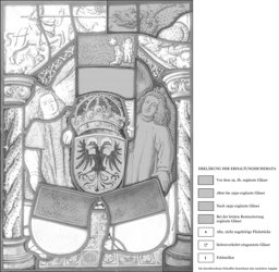Vor blauem Damastgrund erhebt sich die bekrönte Wappenpyramide Solothurn-Reich. Sie wird von zwei auf Fliesenboden stehenden Engeln gehalten. Von diesen trägt derjenige links über seiner Alba eine damaszierte, sandfarbene Dalmatika. Sein lediglich in eine Alba gekleideter Gefährte hält in der Rechten das Solothurner Banner, dessen Eckquartier den hl. Ursus kniend vor Christus in Gestalt des Ecce homo zeigt (analog zum 1512 von Papst Julius an Solothurn verliehenen Banner). Engel und Wappen rahmen seitlich zwei aus gewundenen Baumstämmchen gebildete Säulen, über die sich ein zierlicher gelber Astbogen mit Blattwerk schwingt. Das Oberbild zeigt den berittenen hl. Georg im Kampf gegen den Drachen.