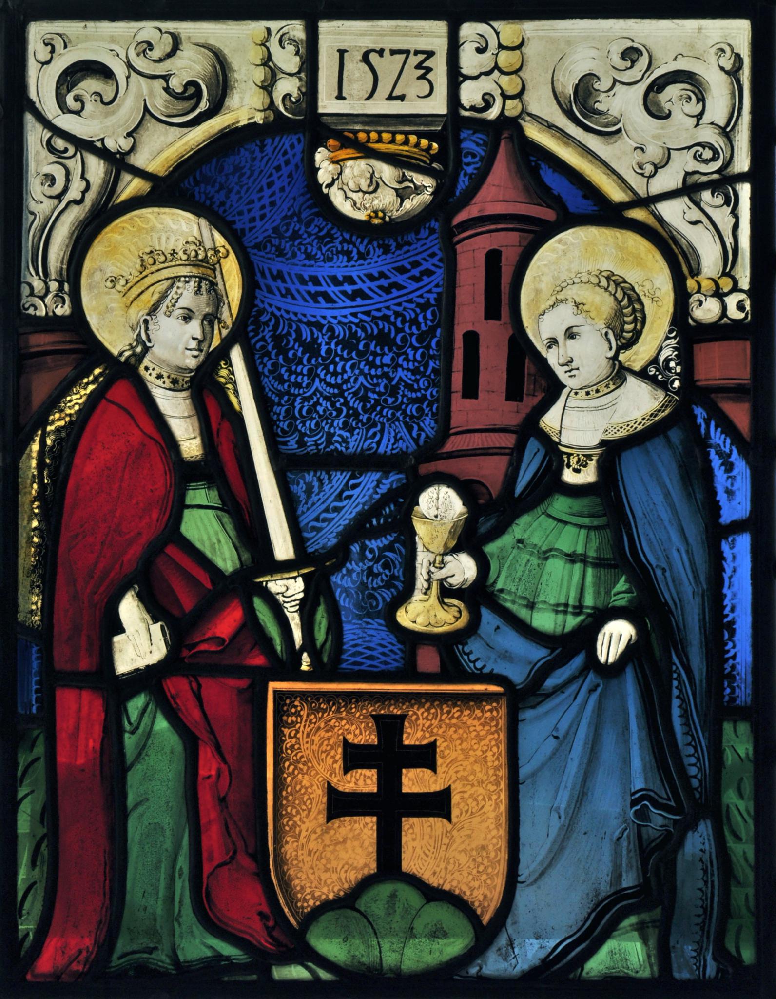 Vor blau gefiedertem Damastgrund sind zwei weibliche Heilige zu Seiten des ergänzten Wappens postiert. Von den beiden grün gewandeten Frauen trägt die Schwert und Buch haltende Heilige einen roten Mantel. Ihre Gleichsetzung mit der hl. Katharina von Alexandrien ist nicht völlig gesichert, da sie hier ohne Rad, deren Haupterkennungszeichen, erscheint. Die ihr gegenüber stehende Gefährtin gibt sich anhand des hinter ihr erscheinenden Turmes und des Hostienkelches in ihrer Hand als hl. Barbara zu erkennen. Über zwei roten Kapitellen setzt ein Rundbogen an, dessen Mauerflächen mit Ranken belegt sind. Oberhalb des hängenden Schlusssteins ist eine Tafel mit dem Stiftungsdatum angebracht.