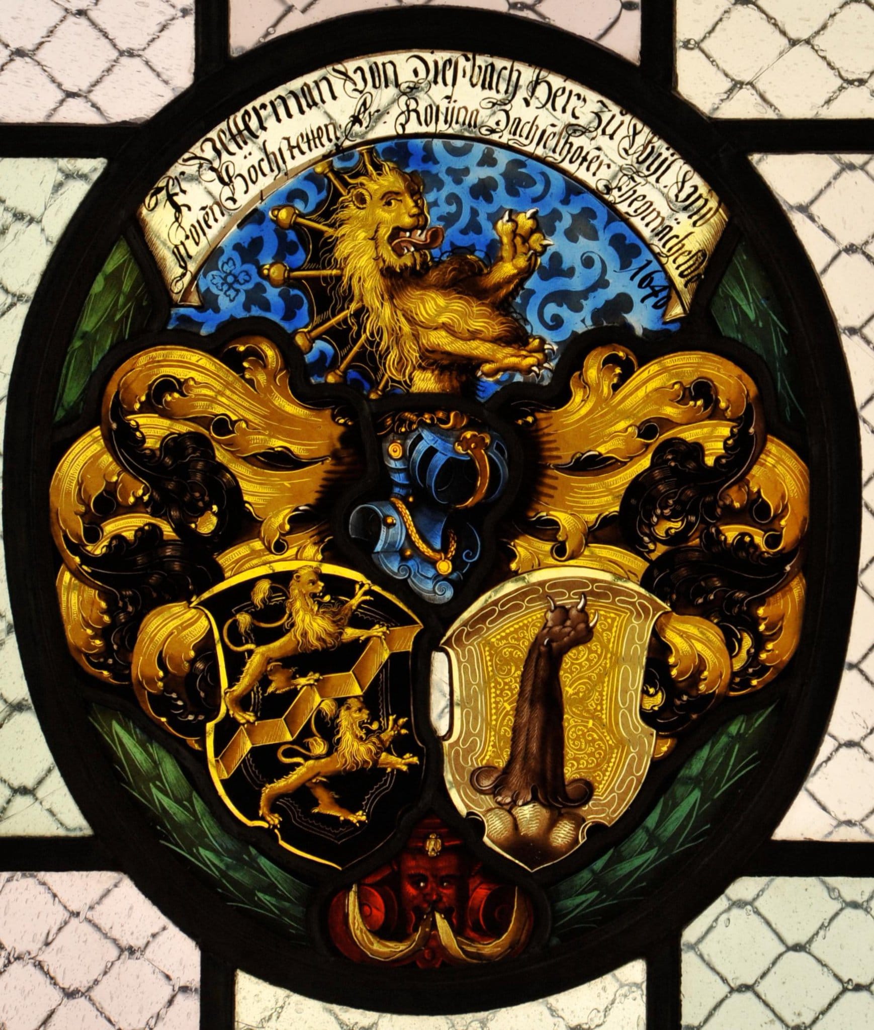 Petermann von Diesbach (1614–1679), Sohn des Ludwig (1589–1648) und der Anna Rosina von Wattenwyl, war Herr zu Begnins, Cottens, und Martheray sowie 1626 Erbe der Herrschaft Wil, zu der Wil/Schlosswil, Oberhünigen und Grosshöchstetten gehörten. Er gelangte 1645 in den Grossen Rat zu Bern, wurde 1651 Vogt zu Morges und 1673 Sechzehner zu Gerbern. Petermann von Diesbach war seit 1638 mit Rosina Dachselhofer verheiratete. Nach ihrem Tod ehelichte er 1662 Magdalena von Bonstetten (* 1624), eine Tochter Rudolf von Bonstettens und Magdalena von Erlachs sowie Witwe des Johann Jakob von Ligerz. In dritter Ehe war Petermann von Diesbach mit Anna Maria Merveileux, Tochter des David und der Maria von Bonstetten verheiratet (HBLS 2/1924, S. 713; Kessel 2015). In der Kirche von Schlosswil hat sich die Grabplatte des Stifters erhalten. 1660 machte er eine Scheibenstiftung in die dort erneuerte Kirche in seiner Funktion als Herr zu Wil (Schlosswil). Sie bildet zusammen mit derjenigen seiner damaligen ersten Frau Rosina Dachselhofer eine Doppelstiftung. Beide Glasgemälde stammen aus der Hand des Berner Glasmalers Matthias Zwirn, der die Männerscheibe mit seinem Monogramm signierte. 1640 machte Petermann von Diesbach zudem die Wappengabe in die rund 10 Kilometer südlich von seinen Herrschaftsorten Schlosswil und Grosshöchstetten gelegenen Kirche Oberwichtrachs. Ob es allein nachbarschaftliche Beziehungen waren, die ihn zur Stiftung dorthin veranlassten, weiss man nicht (für die Zeit um 1640 ist keine Kirchenerneuerung bezeugt). Seine Wappengabe wurde 1745 vom Vorgängerbau in die heutige Kirche übernommen.