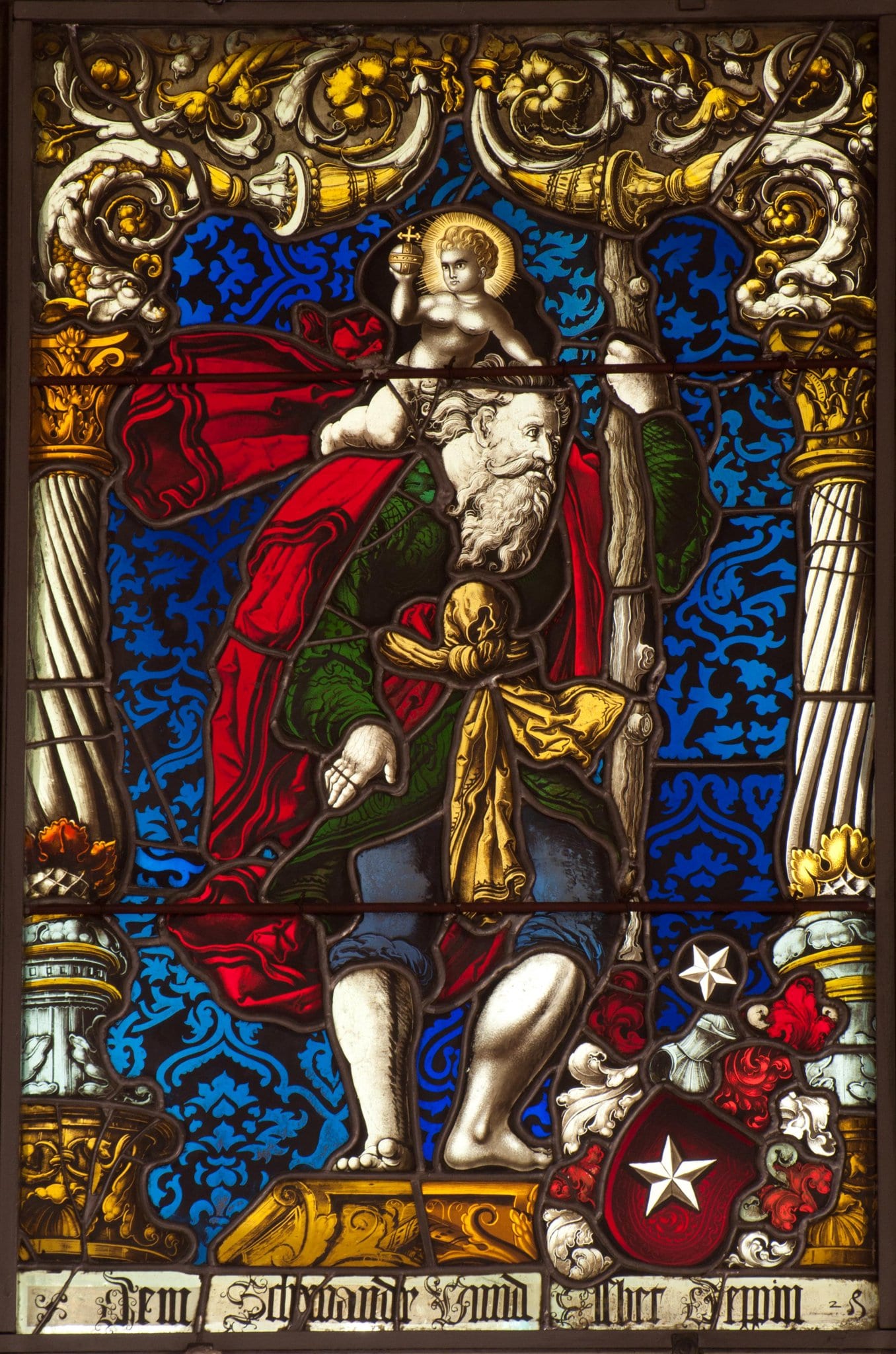 Vor blauem Damastgrund ist Christophorus in violetten Hosen, grünem Gewand und einem wehenden roten Mantel stehend auf einem kleinen gelben Podium festgehalten. Den eine Kugel mit Kreuz emporhebenden Christusknaben als schwere Last auf seinem Rücken tragend, muss er sich mit seiner Linken auf einen Stock stützen. Zu seinen Füssen ist das Vollwappen des Stifters angebracht. Als seitliche Rahmung dienen Balustersäulen mit gewundenen Schäften auf hohen Postamenten. Darüber erhebt sich ein in der Manier Hans Holbeins d. J. gestalteter Bogen aus Rollwerk mit Pflanzen- und Tiermotiven. Dem Scheibenfuss entlang zieht sich die Stifterinschrift hin, die ihre Fortsetzung auf dem Glasgemälde von Schwanders Frau findet.