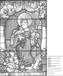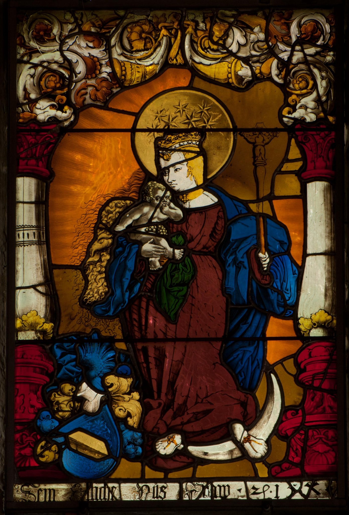 Im Zentrum erscheint die von einer Strahlenglorie umfangene Mondsichelmadonna. In Sandalen auf der Mondsichel stehend, ist die Himmelskönigin in ein weinrotes Gewand und einen blauen Mantel gehüllt. Ihr Haupt schmückt eine Perlenkrone und ihren Nimbus zieren sieben Sterne – vermutlich als eine Anspielung auf die "sieben Freuden Mariä". Während sie in ihrer linken Hand eine Art Zepter mit dem Gekreuzigten hält, trägt sie auf dem rechte Arm den nackten, traubenlutschenden Jesusknaben. Zu ihren Füssen befindet sich das Vollwappen der Stifterin und darunter setzt sich die auf Schwanders Glasgemälde beginnende Inschrift fort. Die Figur umrahmt eine Renaissance-Arkade aus Balustersäulen mit roten Basen und Kapitellen sowie einem Rollwerkbogen aus Pflanzen- und Tiermotiven.