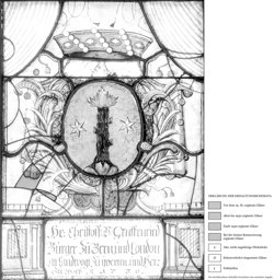 Zwei kleinere Gläser links unterhalb des Wappenschildes neu ergänzt; Sprungbleie; die Verbleiung erneuert.