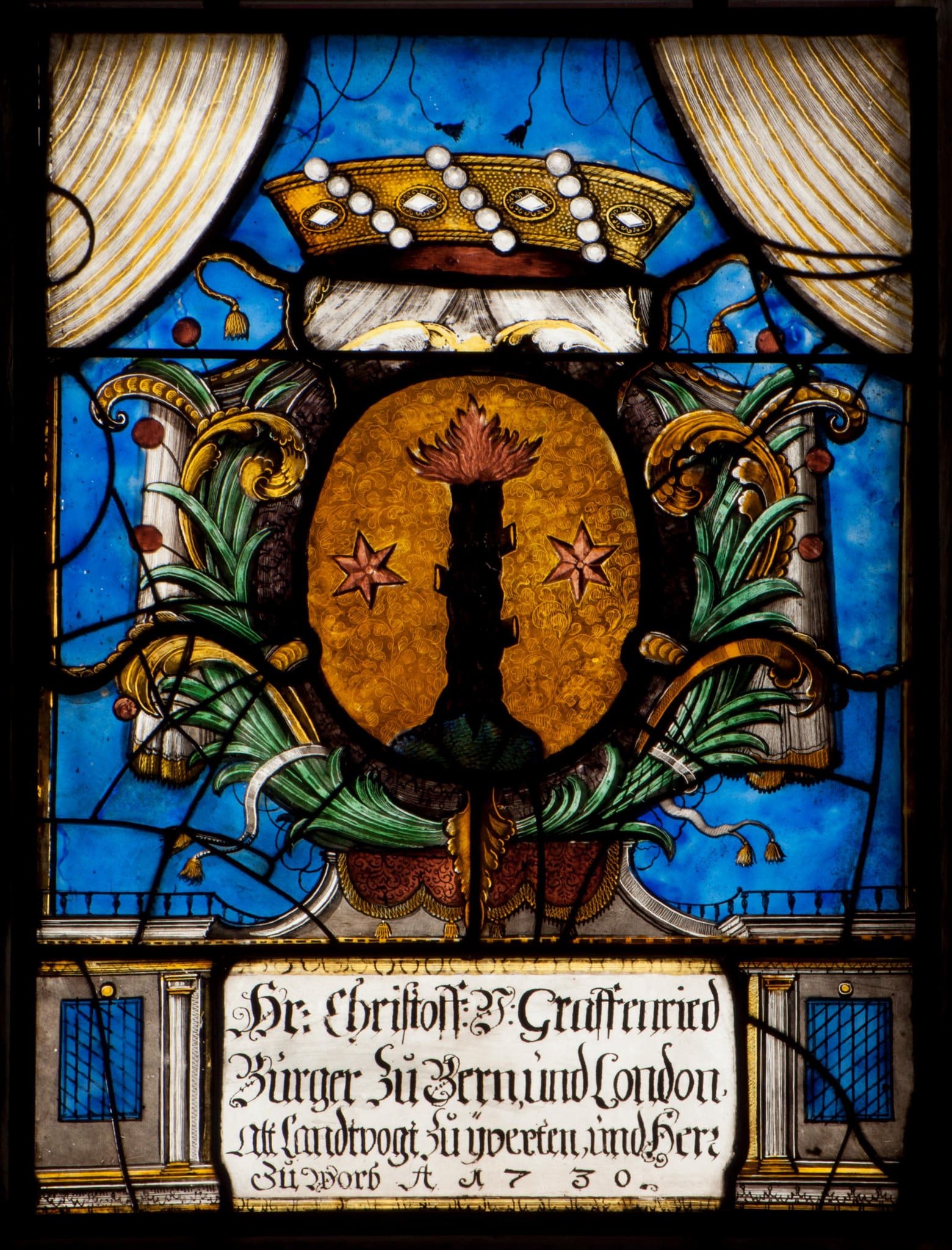 Christoph von Graffenried übernahm 1730 in der Nachfolge seines Vaters die Herrschaft Worb. Dies bildete den Anlass zu seiner damaligen Wappengabe in die Kirche (Rubli, Braun). Der Stil seiner Scheibe lässt keinen Zweifel daran, dass er dieselbe – wie sein Vater die seine vier Jahr zuvor – bei Andreas Fueter in Auftrag gab.