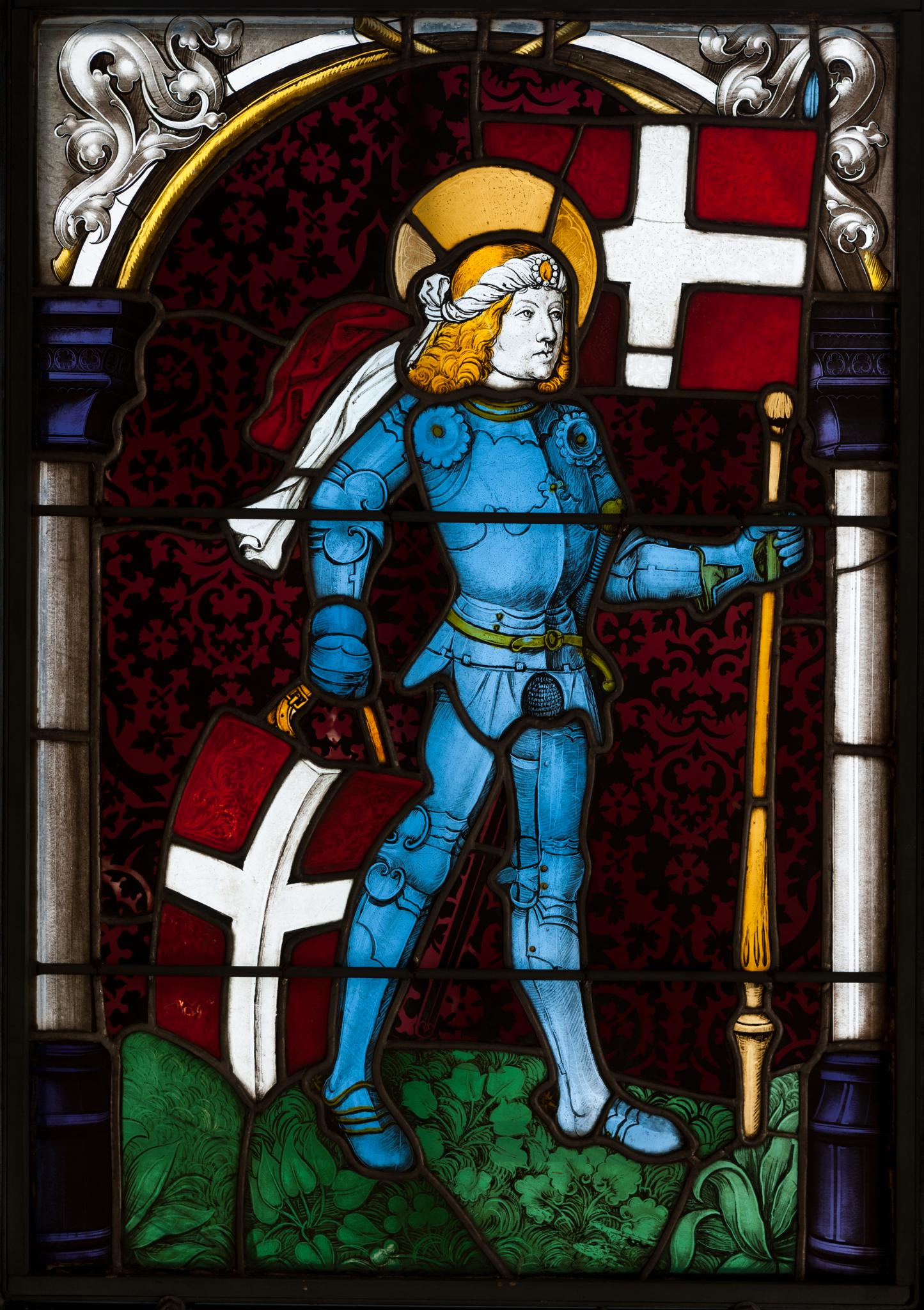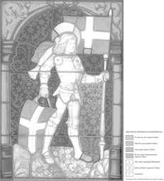 Die ganze Arkadenrahmung, zahlreiche Gläser im Damast sowie je ein kleines Stück im Nimbus des Heiligen und im Bannerkreuz neu ergänzt; der linke Vorderfuss des Heiligen und das kleine Rasenstück darüber alt ergänzt. Von den zwei grösseren Gläsern im Nimbus und von den zwei Gläsern im Mittelstück der Fahnenstange scheint jeweils das eine auch alt ergänzt zu sein. Um welches es sich dabei handelt, lässt sich aber nicht mit Bestimmtheit sagen. In den Originalgläsern stellenweise geringer Lochfrass; Sprungbleie; die Verbleiung erneuert.