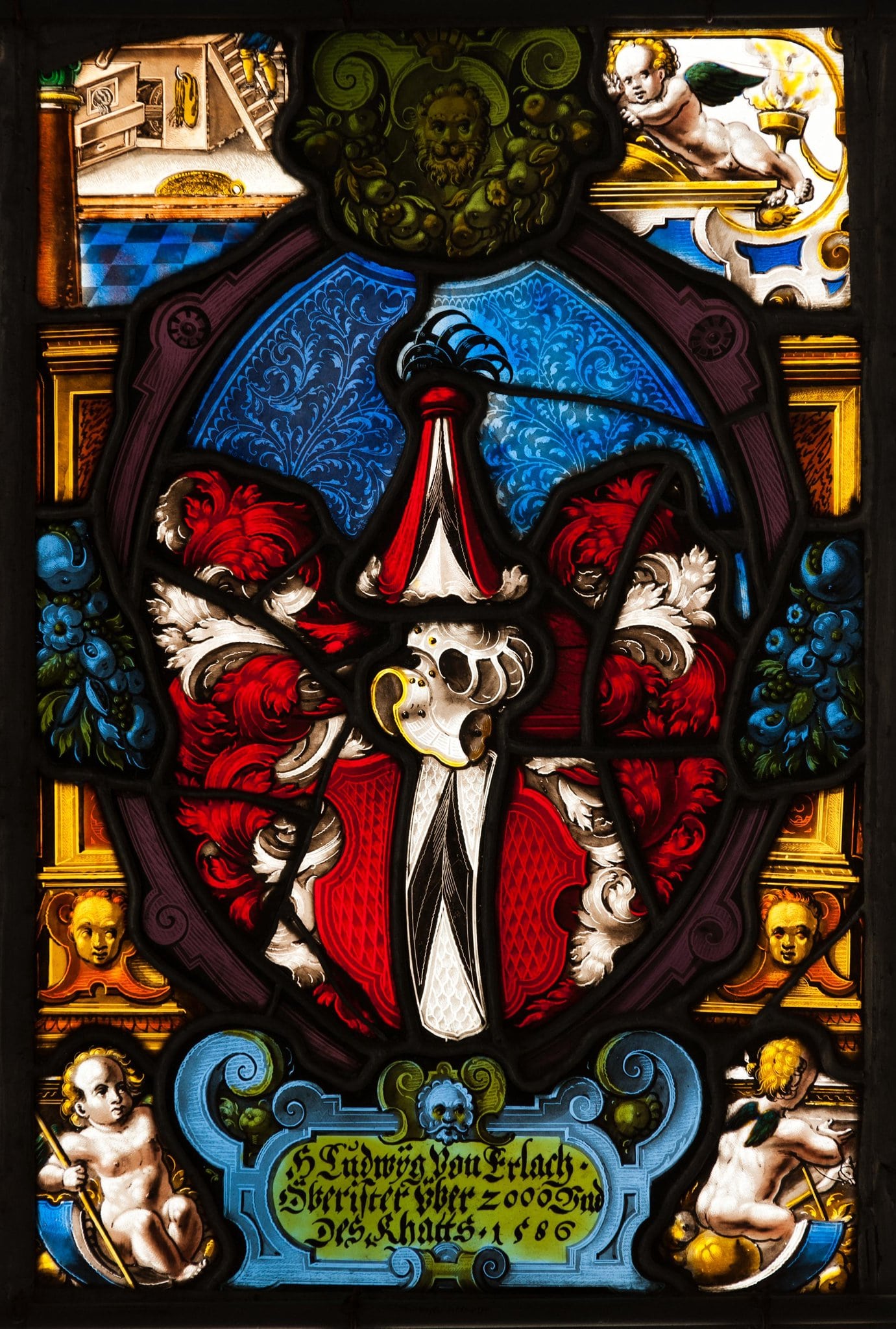 In einer ovalen, violetten Rollwerkkartusche ist das Vollwappen des Ludwig von Erlach vor gefiedertem blauem Damastgrund dargestellt. Die Stifterinschrift befindet sich am Scheibenfuss in einer hellblauen Rollwerkkartusche. Während diese eine Kopfmaske ziert, ist die mit einem Fruchtbouquet behängte grüne Rollwerkkartusche am Scheitel des Ovalrahmens mit einer Löwenmaske geschmückt. Die vier Bildecken sind mit Putten besetzt (an Stelle desjenigen oben links ist ein Flickstück eingefügt).