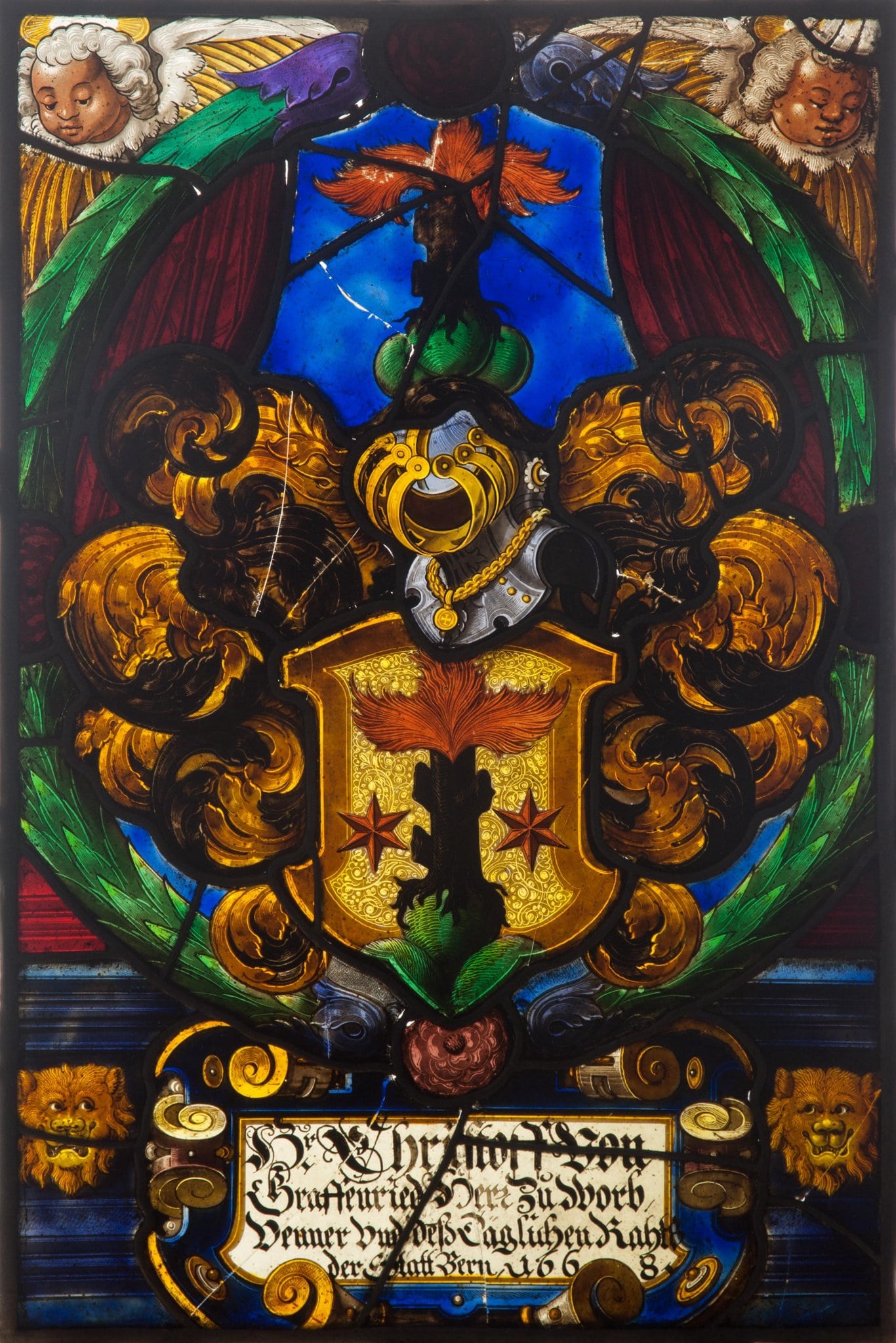 Von Graffenrieds Scheibe entspricht in Stil, Komposition und den Massen exakt den 1668 von Kirchmeier Vinzenz Stürler, Ratsmitglied Karl von Bonstetten und Schultheiss Samuel Frisching in die Nydeggkirche von Bern gestifteten Glasgemälden. Obwohl Johann Rudolf Rahn sowie Franz Thormann und Wolfgang Friedrich von Mülinen in ihrer Auflistung der 1883 beziehungsweise 1896 in der Nydeggkirche vorhandenen Glasgemälde die Scheibe von Graffenrieds nicht erwähnen, ist davon auszugehen, dass diese 1668 dorthin gelangte (vermutlich wurde sie bei einer Kirchenrenovation vor 1883 aus dem Bau entfernt). Wie die anderen Scheiben von 1668 in der Nydeggkirche stammt sie von Hans Jakob Güder.
