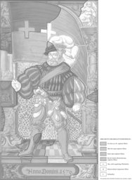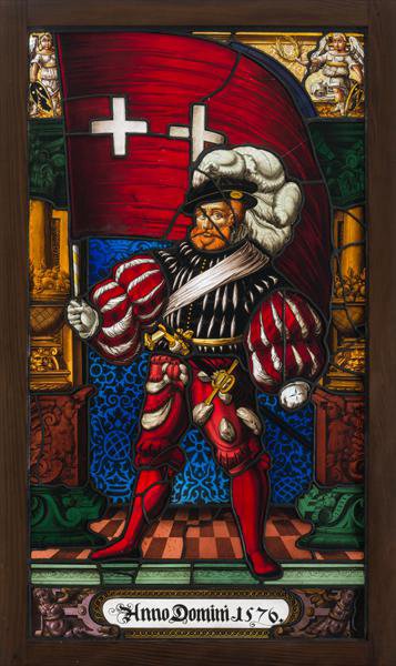 Vor blauem Damastgrund steht auf Fliesenboden ein bärtiger Bannerträger in rot-weiss geschlitztem Hemd, rot-weiss geschlitzten Hosen und schwarz-weiss geschlitztem Wams. Er trägt ein Federbarett und ist mit Schwert und Schweizerdolch bewaffnet. Das von ihm in der Rechten empor gehaltene unbekannte Banner zeigt auf rotem Grund zwei weisse Kreuze (davon das eine allerdings neu). Die Figur rahmen seitlich zwei gelbe Pfeiler mit vorgelagerten Balustersäulen. Der darauf ruhende grüne Flachbogen ist durch das Banner weitgehend verdeckt. In den oberen Bildecken ist je ein Engel postiert, der in seinen Händen einen Kranz und einen Schild mit unbekanntem Wappen hält. Zwei weitere Engel flankieren das Podium mit der Inschrift am Scheibenfuss.