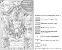 Das Scheibenzentrum nimmt vor grünem Damastgrund das Vollwappen des Diebold von Erlach ein. Es ist unter den eingezogenen blauen Bogen gesetzt, der seitlich auf je zwei Stützen ruht. Vor diesem postiert sind zwei allegorische Frauengestalten, links die Spes mit ihrem Attribut, dem Anker, sowie rechts die Fides mit Kreuz und Hostienkelch in den Händen. Im Oberlicht ist eine Falkenjagd mit Reitern und Hunden festgehalten. Die Jagdszene wird in der Mitte durch den am Bogenscheitel eingefügten sitzenden Putto in roter Kleidung unterbrochen, der in seinen Händen Krone und Palmzweig hält. Der Stiftername befindet sich am Scheibenfuss in einer blauen Rollwerkkartusche.