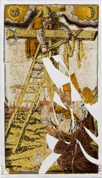Die fragmentarische Monolithscheibe stellt in reduzierter Farbigkeit die Kreuzabnahme Christi dar. Nikodemus steht auf der ans Kreuz gelehnten Leiter und hält das Tuch, mit dem er den Leichnam Christi in den Schoss Mariens heruntergelassen hat.