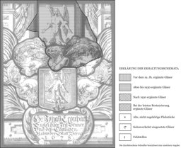Der Wappenhelm mit dessen Zier und ein Teil der Helmdecke neu ergänzt; Sprungbleie; die Verbleiung erneuert.