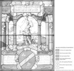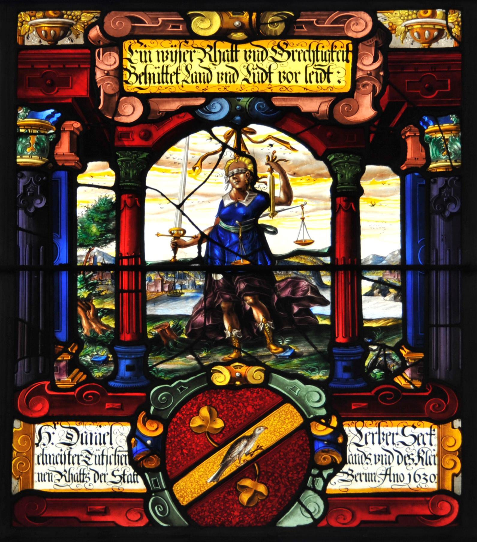 Das Hauptbild zeigt die mit verbundenen Augen Richtschwert und Waage in ihren Händen haltende Justitia. Die in ein langes violettes Gewand und eine blaue Tunika gehüllte Tugendgestalt steht im Vordergrund einer gebirgigen Landschaft mit einer Stadt am Seeufer. Sie wird von einer roten Säulenarkade umrahmt, an die sich seitlich je ein schmaler Durchgang anschliesst. Am Scheitel der vornehmlich in den Farben Rot, Blau und Violett gehaltenen Bogenarchitektur befindet sich in einer Rollwerkkartusche ein Sinnspruch auf die Gerechtigkeit. Den Scheibenfuss füllt die Rollwerkkartusche mit der Stifterinschrift. Ihr zentral vorgestellt ist das in eine ovale Kartusche gesetzte Wappen Daniel Lerbers.