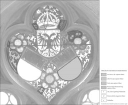 Man darf davon ausgehen, dass einstmals auch die Stiftungen von Bern im Chormittelfenster und von Solothurn im Chorsüdfenster farbige Masswerkverglasungen besassen. Das (zusätzliche) Anbringen des Standeswappens des Herrschaftsherren im Masswerk über dem "Herrschaftsfenster" hatte in spätgotischen Kirchen Tradition. Ein Beispiel dafür liefert die Kirche von Maschwanden im Kanton Zürich, wo im Chor der Stand Zürich seine Fensterstiftung hatte sowie darüber im Masswerk seine bekrönte, von zwei Löwen gehaltene Wappenpyramide Zürich-Reich (Ruoss/Giesicke 2012, S. 72f., Abb. 60). Als um 1510 der Lausanner Bischof Aymon de Montfalcon das zentrale Chorfenster der Kirche von Curtilles verglasen liess, kam darin ebenfalls sein (von Engeln) gehaltenes Wappen zur Aufstellung, und zwar zusammen mit seinem Porträt. Diese Masswerkverglasung steht der Freiburger in Jegenstorf auch insofern nahe, als verschiedene ihrer Felder mit Grisaillerankenwerk und farbigen Blumen geschmückt sind (Fontannaz/Pradervand 2015, S. 279, 283–287, Fig. 28, 351).