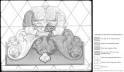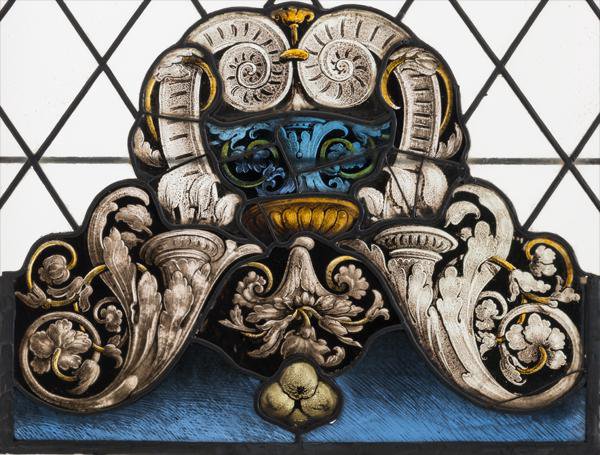 Das herausgelöste Fragment stellt eine Architekturbekrönung dar. Zwei aus von Blattwerk umschlossenen Füllhörnern wachsende gegenständige Voluten bilden einen hohen steinfarbenen Bogen, der eine blau-goldene mit Blattwerk verzierte Vase umschliesst. Dem unten abschliessenden hellen Blütenkelch ist ein gelbes Fruchtgebinde angehängt.