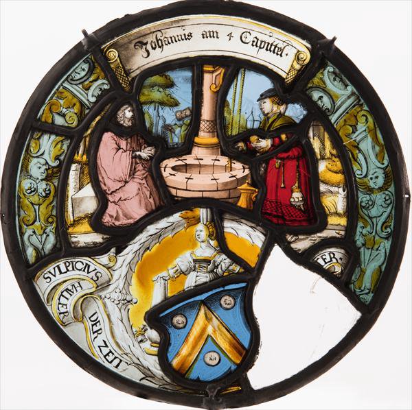 Die Rundscheibe entspricht im Grundmuster dem Rundriss mit dem klagenden Hiob und leerem Wappenschild aus der Zeit um 1555 in der Sammlung Wyss des Bernischen Historischen Museums (⦰ 23,3 cm; Hasler 1996/7, Bd. 1, Kat.-Nr. 201). Möglicherweise stammten die verschollene, nach diesem Entwurf ausgeführte Scheibe und das vorliegende Werk aus einem Glasgemäldezyklus.