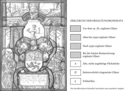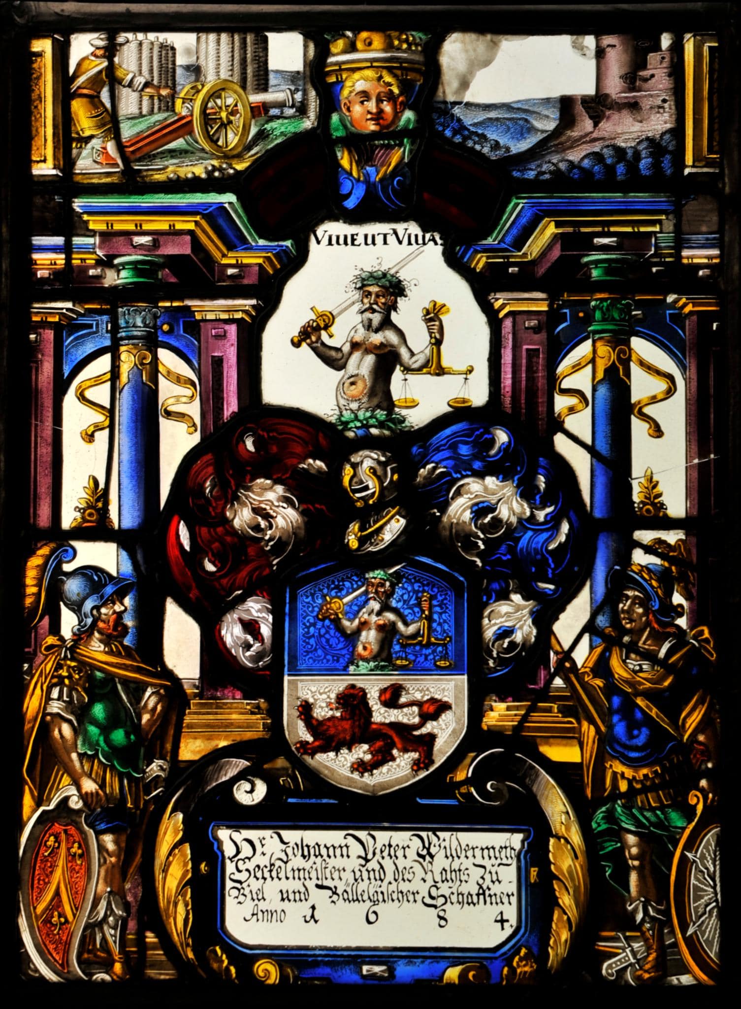 Das Vollwappen des Hans (Johann) Peter Wildermeth ist vor farblosem Grund auf die blaue Rollwerkkartusche mit der Stifterinschrift gesetzt. Diese flankieren zwei je einen Schild haltende Krieger in antiker Rüstung. Der vom Krieger in der Bildecke unten links präsentierte Schild zeigt das Wappen der Bieler Familie Wildermut. Hinter Figuren und Stifterwappen erhebt sich ein dreiachsiger Arkadenbau, dessen beiden Seitenöffnungen eine blaue Säule vorgelagert ist. Darüber zieht sich ein nach hinten fluchtendes Gebälk hin, auf dem ein Flachbogen mit einer Kopfkartusche ruht. Das durch diese Kartusche unterteilte Oberbild stellt eine Burg auf einem Hügel unter Kanonenbeschuss dar.