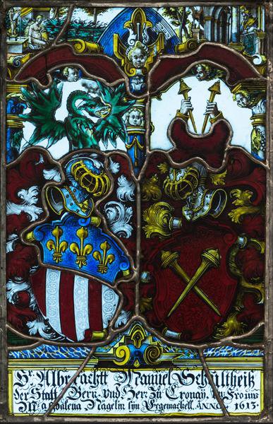 Das Glasgemälde entspricht in Format, Stil und Komposition der aus dem gleichen Jahr datierenden Allianzwappenscheibe Anton Tilliers und Katharina von Wattenwyls im Bernischen Historischen Museum (BHM Bern, Inv. 2890). Beide besitzen den gleichen gezierten Schriftcharakter der Inschrift und werden wohl ehemals an denselben unbekannten Ort gestiftet worden sein. Eine wahrscheinlich auf den gleichen Entwurf zurückgehende, undatierte Scheibe mit den Allianzwappen des Niklaus von Diesbach und der Magdalena von Wattenwyl ist verschollen (BHM Bern, Foto 29446; Pause Hans Drenckhahns im Vitrocentre Romont, Mappe 1). Mit dem vorliegenden Glasgemälde ist auch die im Schema übereinstimmende Allianzwappenscheibe Albrecht Manuels und Magdalena Nägelis von 1608 im Bernischen Historischen Museum eng verwandt (BHM Bern, Inv. 18115). Manuels Scheibe von 1608 zeichnet sich jedoch durch einen dichteren Schwarzlotauftrag und einen schlichteren Inschriftencharakter aus und dürfte daher einer anderen Werkstatt entstammen als die beiden 1613 datierten Wappenscheiben. Sie steht dem Werk Hans Jakob Hübschis nahe, so insbesondere dessen durch Quellen gesicherter Berner Standesscheibe für das Rathaus Luzern im dortigen Historischen Museum (Galliker 2009, Abb. S. 17). Die jüngeren Scheiben von 1613 sind hingegen einem unbekannten Glasmaler zuzuschreiben. Dieser verzichtete auf die dunklen Masken in den mit farbigen Hüttengläsern komponierten Architekturen und ersetzte die ins Schwarzlot gravierten Puttenköpfe durch solche, die mit rötlichem Lot und Silbergelb malerisch komponiert sind.