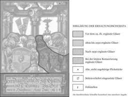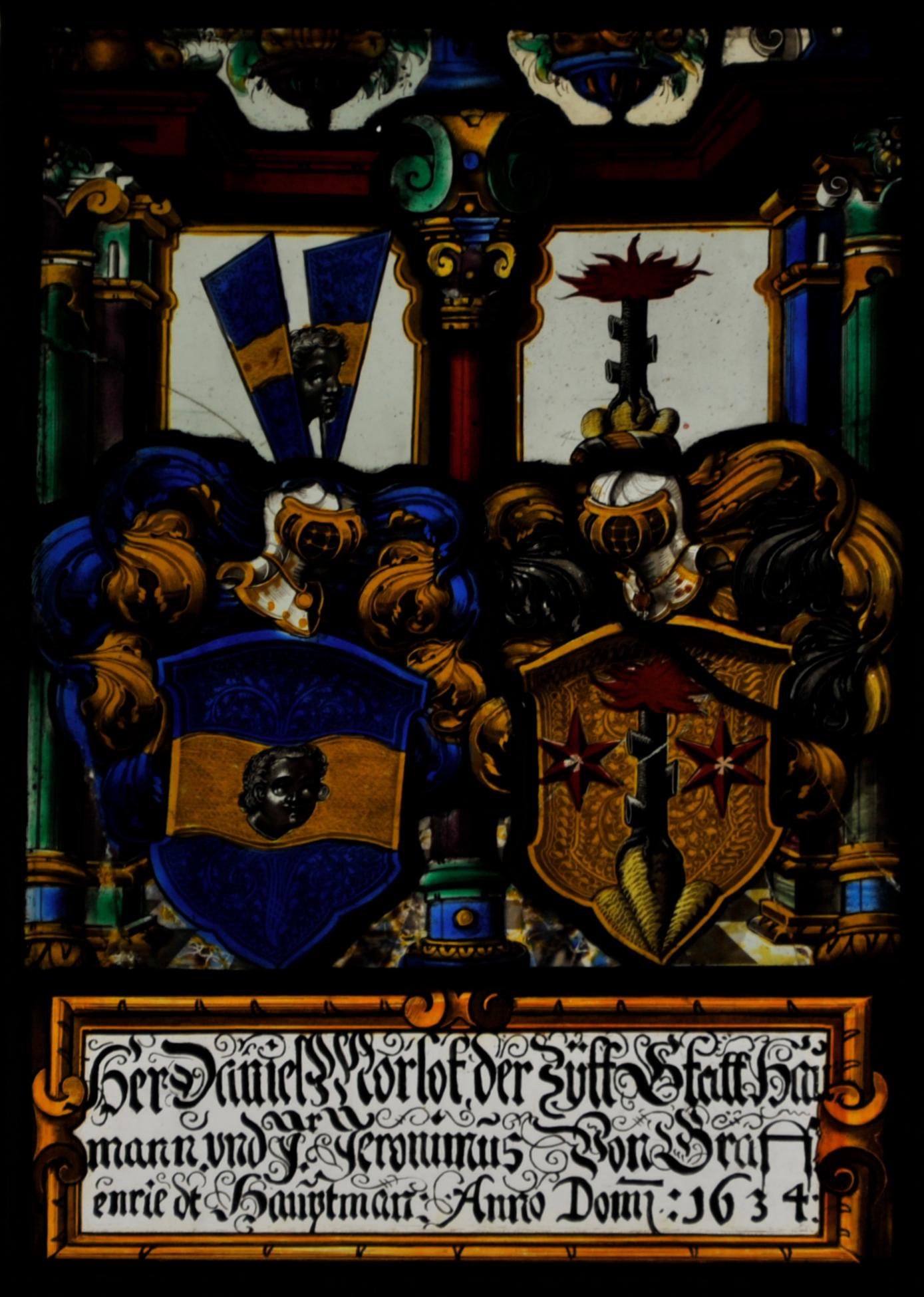 Die in der erneuerten Inschrift festgehaltenen Stifternamen dürften ebenso wie die Jahresangabe historisch korrekte Ergänzungen darstellen (auch die ältere aus der Scheibe entfernte Ergänzung nennt als Stiftungsjahr 1634). Man darf in der Scheibe demnach eine 1634 von Daniel Morlot und Hieronymus von Graffenried gemachte Wappengabe sehen.