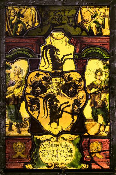 Das auf die grüne Rollwerktafel mit der Stifterinschrift gesetzte Vollwappen des Hans Rudolf Steiger befindet sich im Zentrum einer dreiachsigen, roten und grünen Arkadenarchitektur, deren mittlerer Volutenbogen eine Löwenmaske schmückt. Begleitet wird der Wappenschild von zwei weiblichen Tugendgestalten, der Weisheit (links) und der Beständigkeit (rechts). Die beiden allegorischen Figuren sind in Schrittstellung in den schmalen Seitendurchgängen festgehalten. Darüber erscheinen vor gelben Vorhängen zwei sitzende hornblasende Putten.