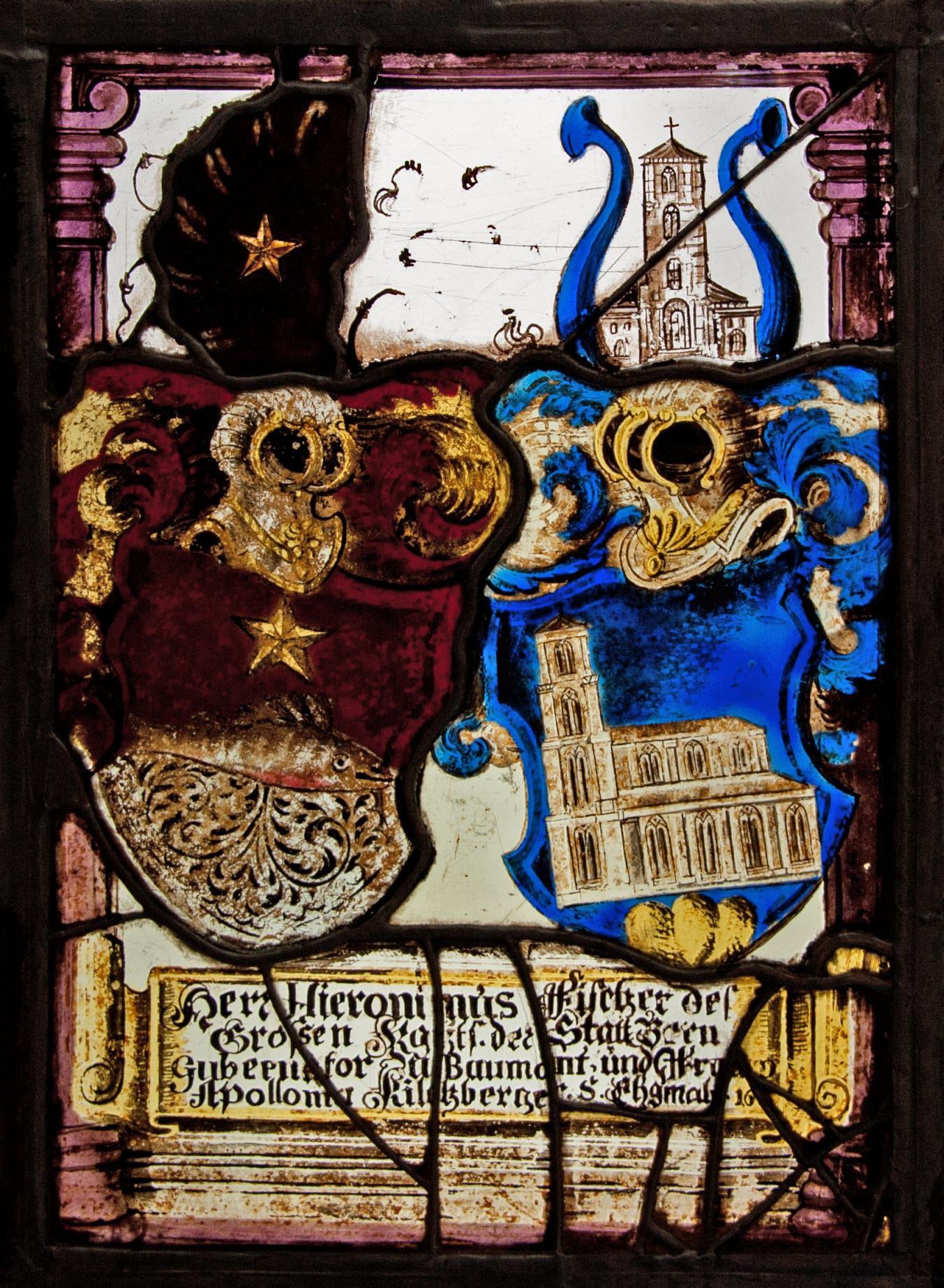 Laut Inschrift liess Hieronymus Fischer seine Allianzwappenscheibe zur Zeit seiner Tätigkeit als Gubernator von Bonmont anfertigen, das heisst zwischen 1689 und 1695. Die ehemalige bernische Vogtei Bonmont liegt im waadtländischen Chéserex bei Nyon rund 136 Kilometer südwestlich von Bern. Trotz dieser erheblichen Distanz scheint Fischer damals die Scheibe bei einem Meister in seiner Heimatstadt in Auftrag gegeben haben. Dort gab es um 1690 noch zwei Glasmaler, nämlich Hans Jakob Güder (1631–1691) und Andreas Fueter (1660–1742). Während die späten Arbeiten Güders wie etwa die Scheibe Johann Rudolf Tilliers von 1689 in der Kirche Hilterfingen Fischers Glasgemälde qualitativ klar überragen, sind die künstlerisch bescheidener anmutenden Werke Fueters in ihrer stilistischen (Rahmen-, Wappen- und Schriftgestaltung) und technischen Ausführung damit gut vergleichbar. Besondere Erwähnung verdient dabei die im Wappen das gleiche Kirchenmodell darstellende Scheibe Johann Friedrich Kirchbergers von 1713 in der Kirche Sumiswald. Obwohl die betreffenden Werke alle aus der Zeit nach 1700 stammen, darf man Fueter für das um mehrere Jahre ältere Glasgemälde Hieronymus Fischers als Schöpfer in Betracht ziehen.