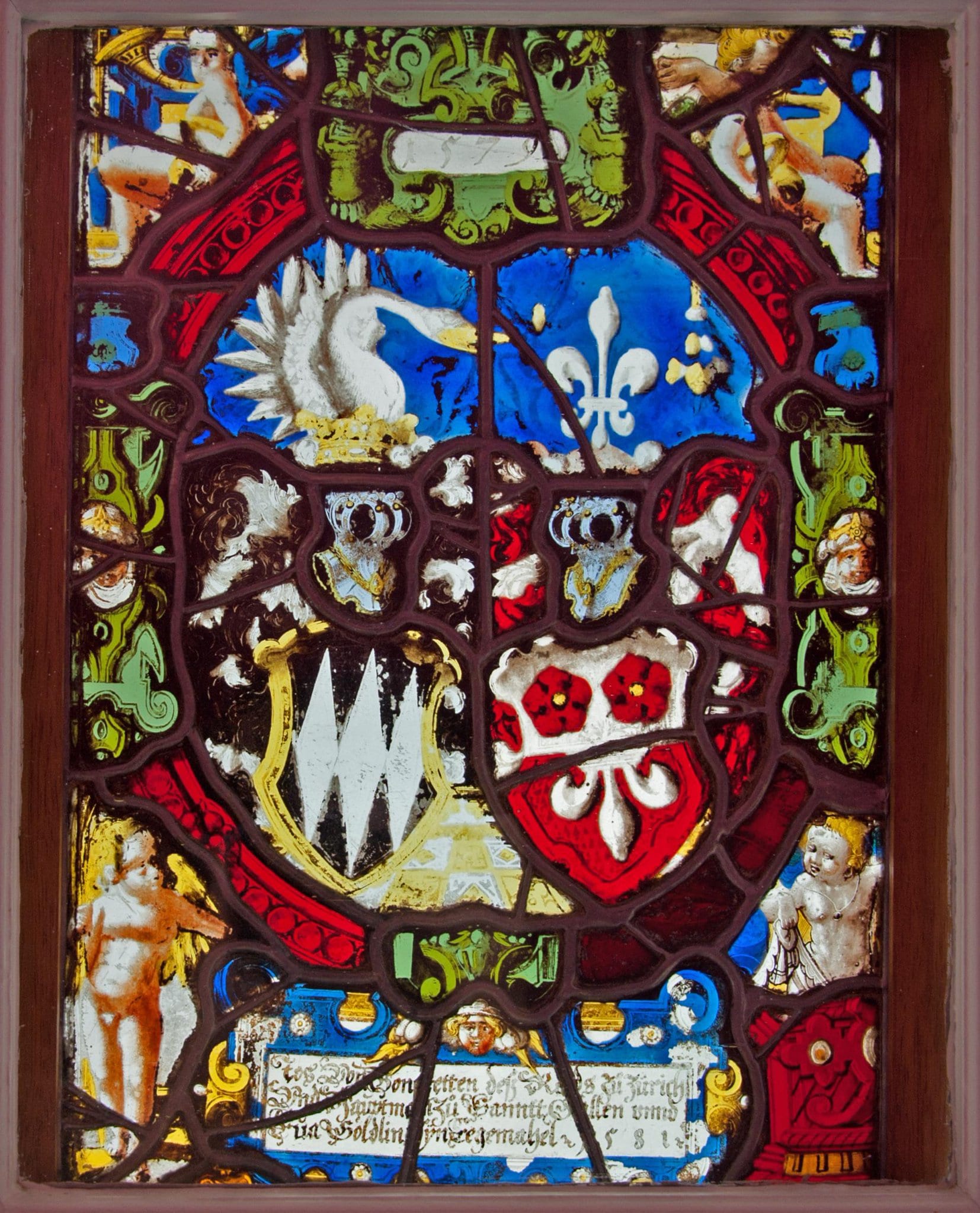Die in der Rollwerkkartusche oben im Ovalrahmen festgehaltene Jahreszahl "1579" entzieht sich einer sicheren Deutung. Wie der Stifterinschrift am unteren Rand zu entnehmen ist, entstand die Scheibe erst zwei Jahre später. Möglicherweise wollte damit der Stifter an ein für ihn wichtiges Ereignis aus dem Jahre 1579 erinnern. Um was genau es sich dabei gehandelt haben könnte, bleibt allerdings rätselhaft.