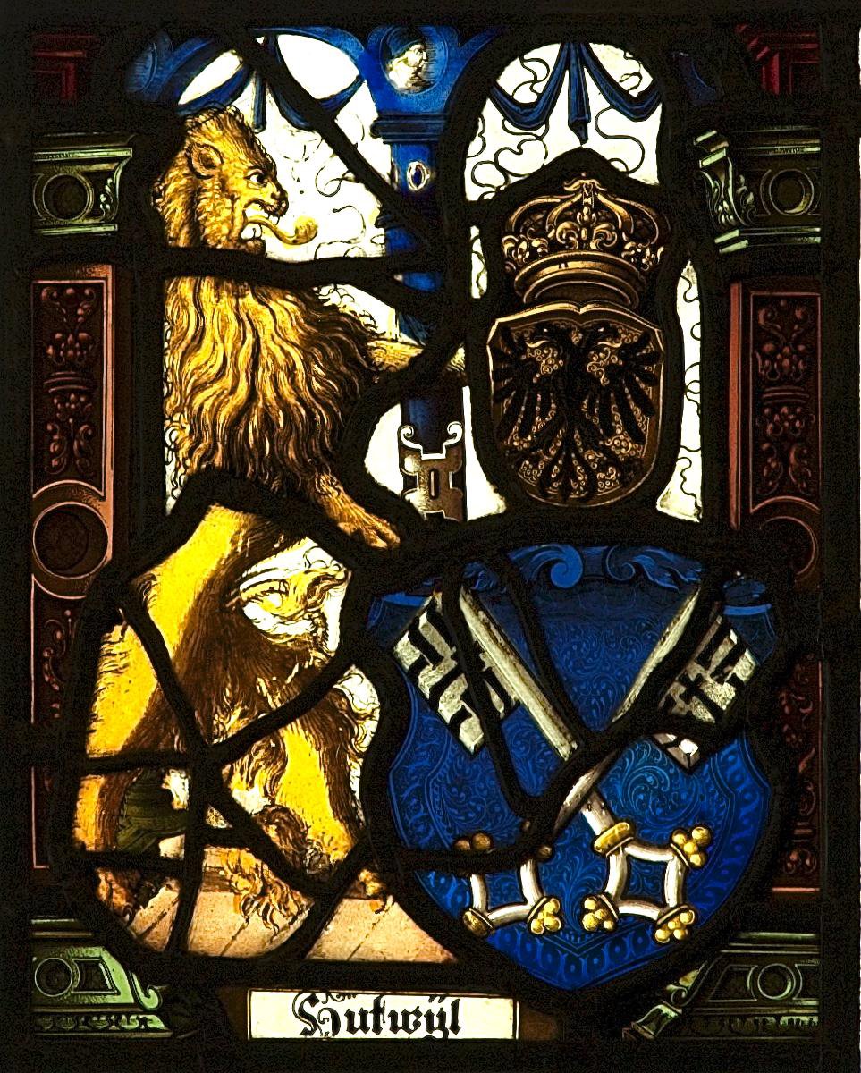 Das vom bekrönten Reichsschild überhöhte Stadtwappen Huttwils wird von einem aufrecht stehenden Löwen gehalten. Dahinter erhebt sich vor farblosem, schnurverziertem Grund eine Doppelarkade aus zwei reich verzierten lila Rahmenpfeilern, einer schlanken blauen Mittelsäule und zwei blauen Bögen. Die erneuerte Stifterinschrift befindet sich unten am schmalen Podium.