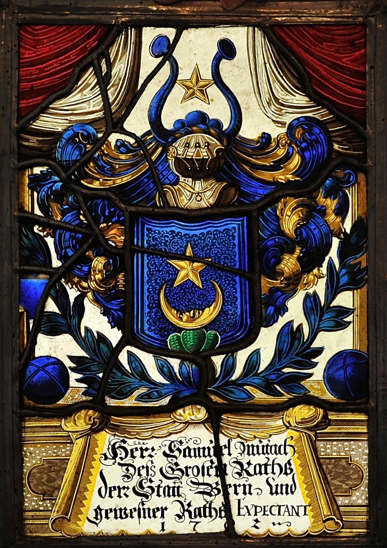 Die 1712 von Samuel Mutach gestiftete Scheibe entstand nach seiner Wahl zum Grossrat. Er nennt sich dennoch stolzer ehemaliger Ratsexpektant. Als solcher stiftete auch sein gleichnamiger Sohn 1722 eine Scheibe, die sich ebenfalls im Schloss Holligen erhalten hat.