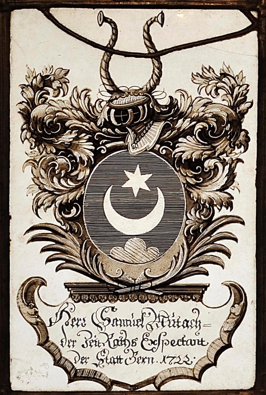 Beim Scheibenstifter handelt es sich um Samuel Mutach (29.8.1690–20.4.1761), den Sohn des Juristen Samuel Mutach (1666–1735) und der Anna Katharina Gross. Am 20. November 1719 heiratete er in Bümpliz bei Bern Anna Elisabeth Stettler, die Tochter Johann Jakobs und der Rosina Sinner. Samuel der Jüngere war in Bern Unterschreiber, 1734 Ratsschreiber und 1738 Staatsschreiber. 1749 wurde er Landvogt zu Lausanne. Zudem war er im Jahre 1722 laut der Stifterinschrift Ratsexpektant (HBLS 5/1929, S. 223; Kessel 2016). Im Schloss Holligen existiert auch eine Scheibe seines Vaters von 1702, auf der sich dieser "gewesner Ratsexpektant" nennt, ein Amt, das derselbe 1699, also 23 Jahre früher als sein Sohn bekleidet hatte.