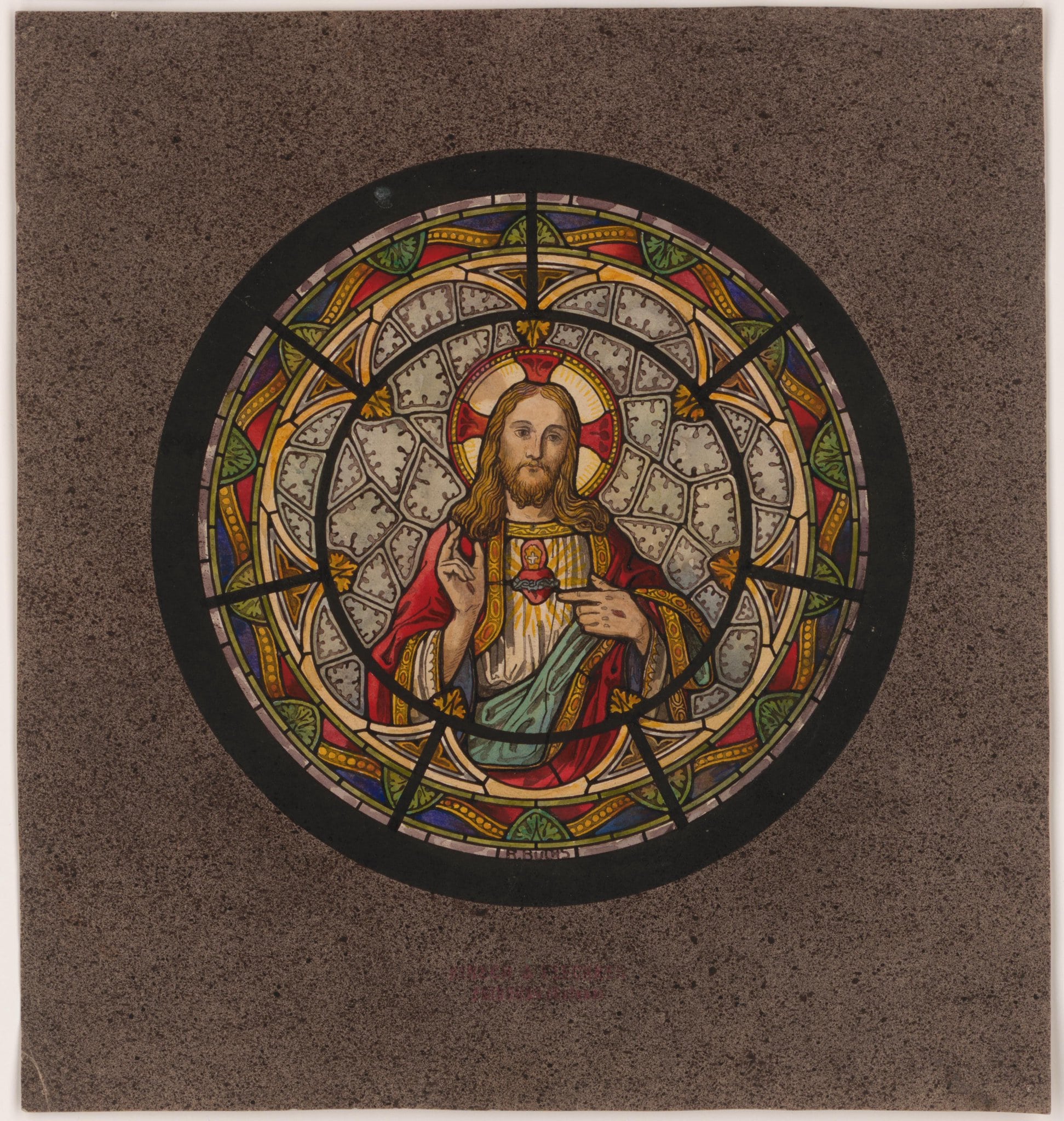 Cette maquette en couleur consacrée au Christ au Sacré-Coeur est le dessin préalable pour la fenêtre axiale du choeur de l’église Saint-Jean-Baptiste à Grolley. Le Christ est entouré sur la maquette d’une bordure à sept lobes alors que sur le vitrail il y a huit lobes. Le vêtement du Christ a été adapté en conséquence dans la partie inférieure pour qu’il puisse s’inscrire à l’intérieur de la bordure. Stylistiquement, le visage du Christ est quelque peu différent sur le vitrail. Il ressemble davantage aux visages des saints présents dans les fenêtres du choeur qui sont dessinés avec de grands yeux en amande. Le carton (KF_1425) pour cet oculus montre uniquement la partie figurée du Christ sans la bordure.