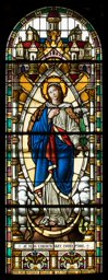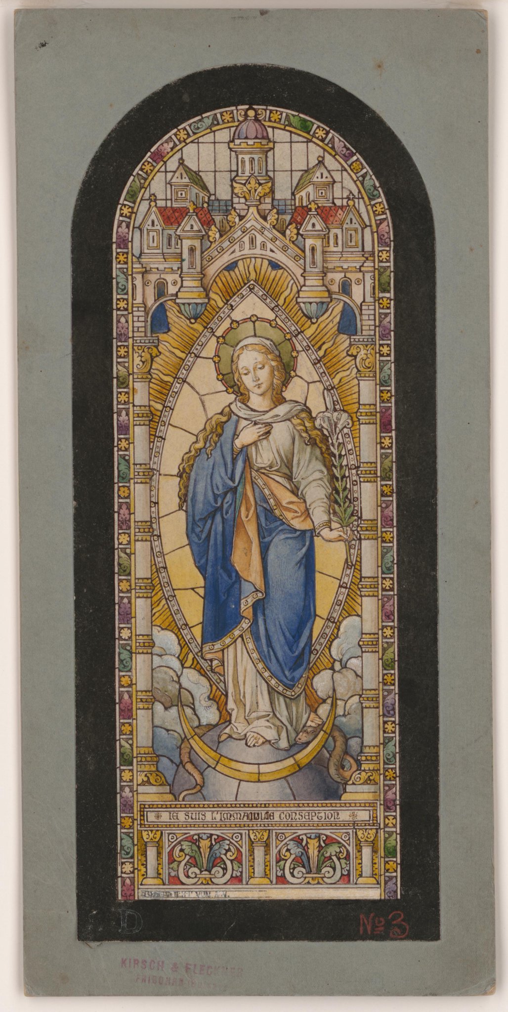 La Vierge, entourée d’une mandorle, est debout sur un globe et pose son pied gauche sur la tête du serpent, des nuées l’entourant et un croissant de lune figurant au premier plan. Alors qu’elle porte sa main droite à son coeur, elle tient un lys de la main gauche. La scène est insérée dans une ouverture trilobée surmontée d’une architecture qui se détache dans la partie supérieure sur un fond de vitrerie à bornes rectangulaires. Le tout est entouré d’une fine bordure à motifs végétaux. En bas apparaît un décor ornemental.