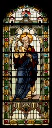 Saint Pierre, debout et présenté de trois quarts, tient de sa main droite deux clefs et de la gauche un livre. Chauve avec une touffe de cheveux sur le devant, il porte la barbe. Il est vêtu d’une toge et d’un manteau. Il est est inséré dans une ouverture composée d’arcs en mitre et lobés surmontée d’une architecture qui se détache dans la partie supérieure sur un fond de vitrerie à bornes rectangulaires. Le tout est entouré d’une bordure à motifs végétaux.