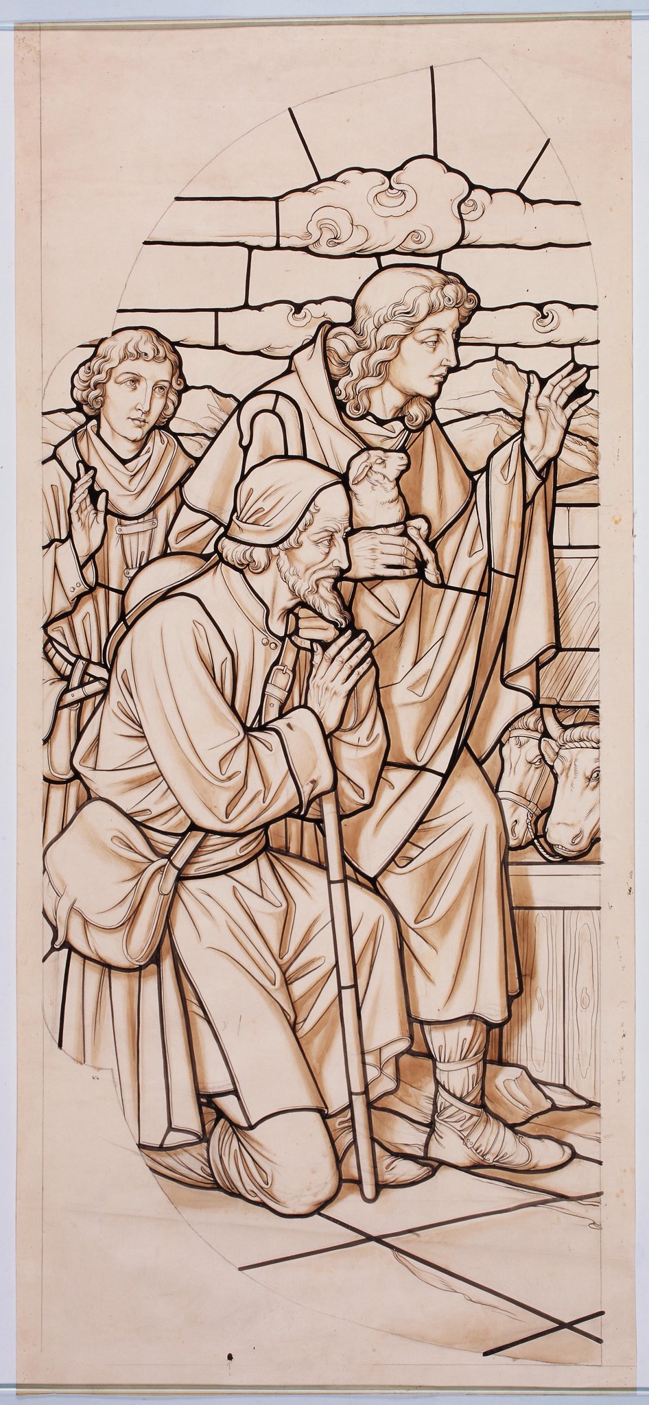 Sur cette partie de gauche de l’Adoration des bergers, trois bergers viennent rendre hommage à l’enfant Jésus. Au premier plan, le premier est agenouillé, les mains jointes. Il porte une besace en bandoulière et une canne. Le second est debout et porte un agneau dans son bras droit. Derrière, le troisième, plus jeune, est debout et lève sa main droite en signe de salutation. En bas à droite, les têtes de l’âne et du boeuf sortent de l’étable, et dans le fond est figuré un paysage avec un ciel traversé par deux bandes horizontales de nuages.
