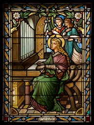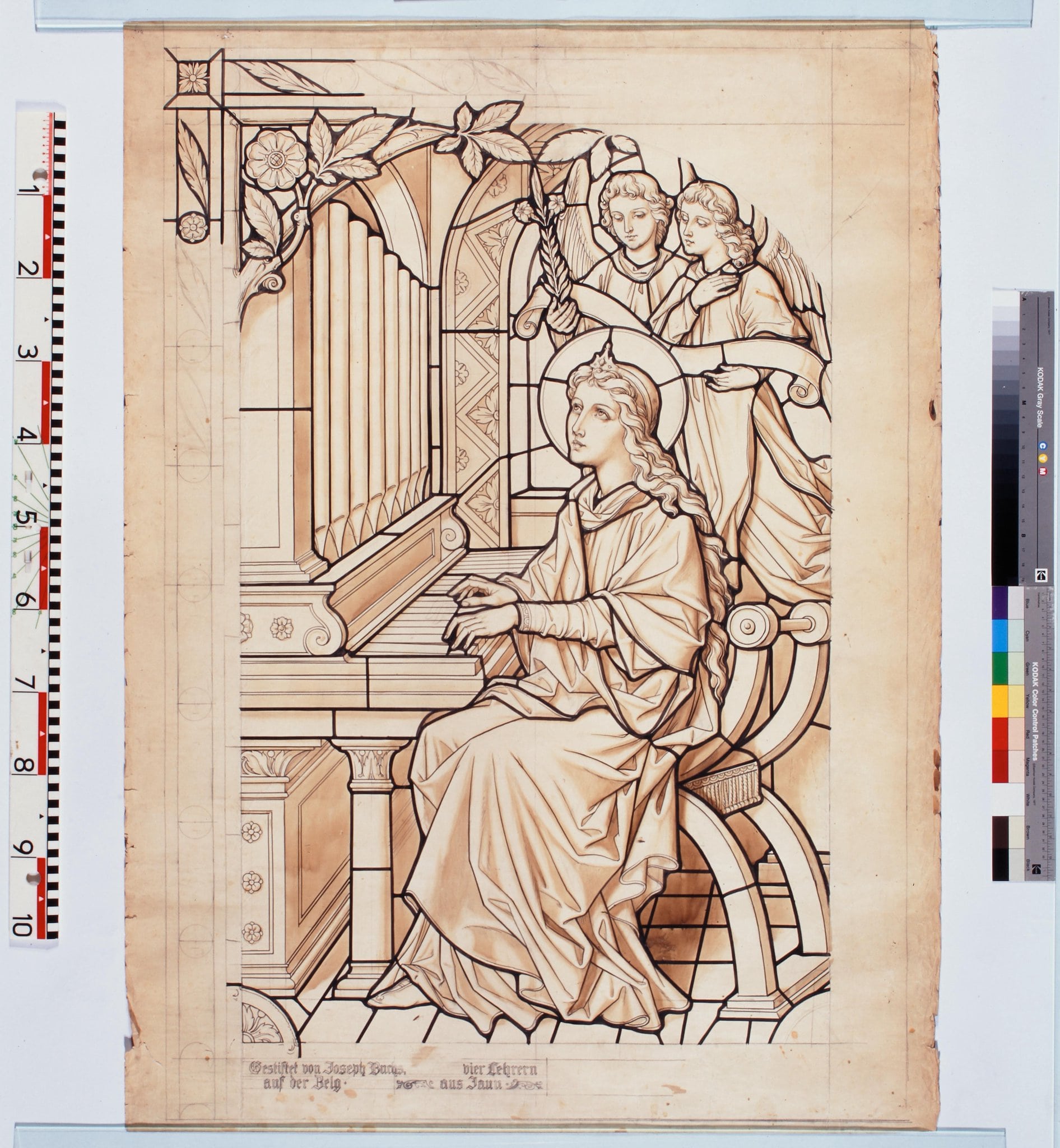 Sainte Cécile, assise sur un fauteuil et légèrement tournée vers la gauche, joue de l’orgue. Derrière elle, deux anges la regardent. Celui de gauche tient un lys et celui de droite porte sa main droite sur son coeur. Ensemble ils tiennent un phylactère. Derrière eux, se trouve une ouverture en plein cintre décorée d’une large bordure ornementale. En haut à droite, une branche de rosiers avec des feuilles et des roses dessinent une bordure. A gauche une bordure est esquissée.