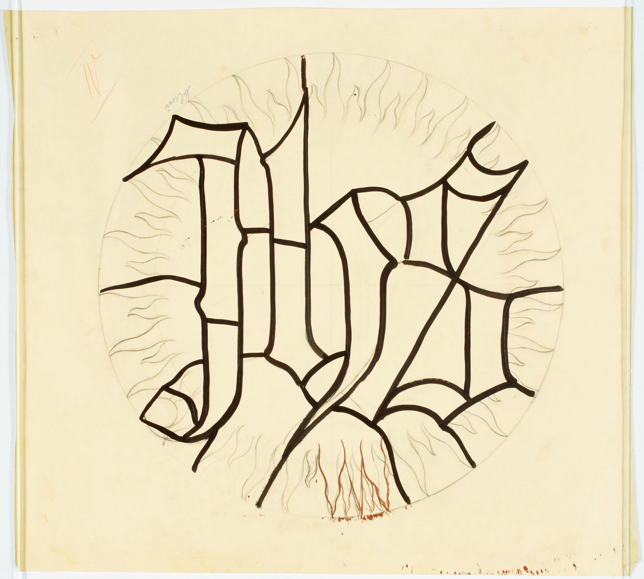 Ce carton en noir et blanc est le modèle précis à l’échelle 1:1 du médaillon au sommet de la quatrième fenêtre à double lancette située dans le nef à droite de l’église Saint-Jean-Baptiste à Grolley. Bien que l’ensemble des cartons illustrant les médaillons pour les vitraux de la nef ne soient pas signés, nous pouvons dire qu’ils sont très certainement de la main de l’artiste Raymond Buchs.
