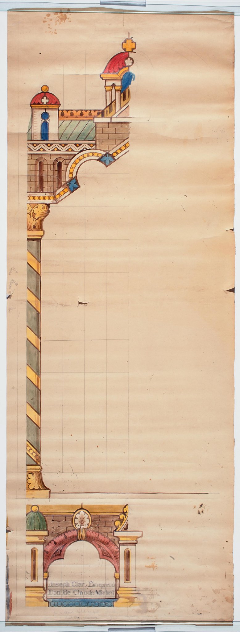 Carton pour l'encadrement architectural d'un vitrail dont seule la partie gauche est représentée. Elle présente un large dais surmonté de tourelles, soutenu par une colonne corinthienne et une arcade trilobée dans la partie inférieure.