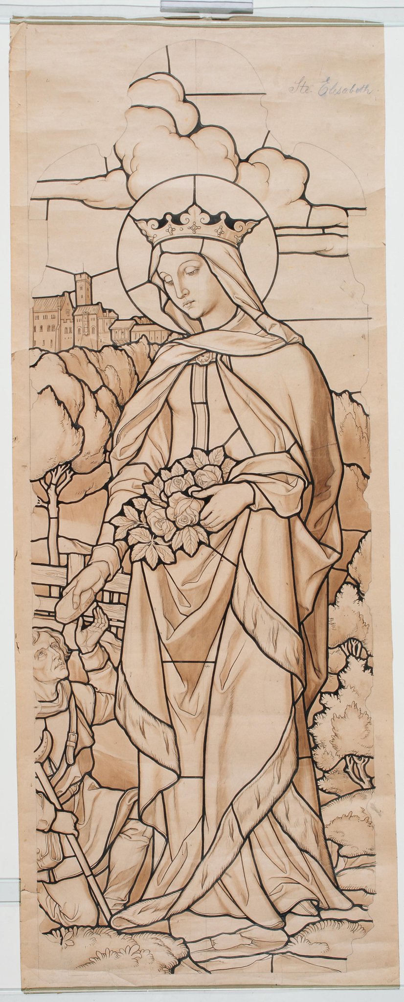 Ce carton, en noir et blanc, est le modèle précis et à l’échelle 1:1 de la partie figurée droite du vitrail consacré à saint Laurent et sainte Elisabeth de Hongrie pour la fenêtre du transept gauche de l’église Saint-André à Onnens. Toute la partie décorative manque mais la forme trilobée de l’ouverture est indiquée avec précision.